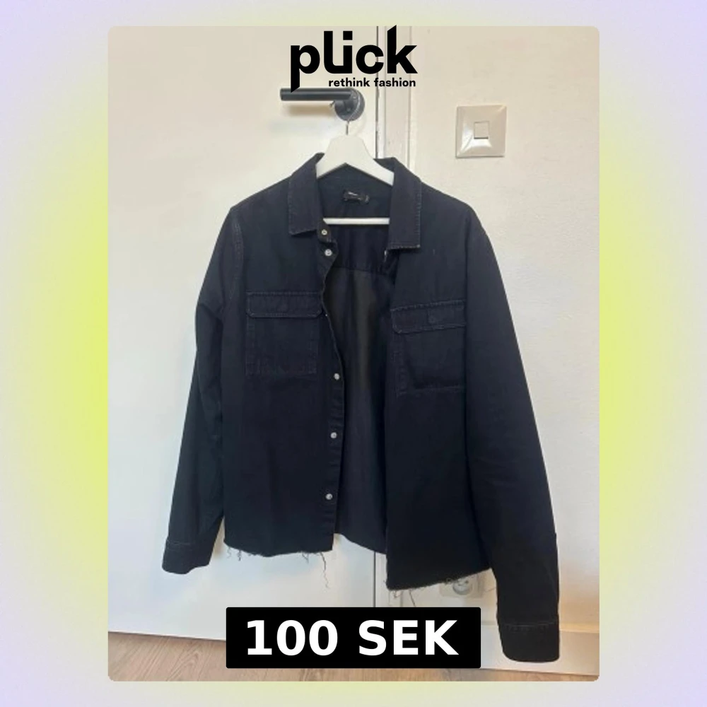 Säljer en svart jeansjacka med rå, fransig nederkant och klassisk krage. Jackan har två bröstfickor med lock och knäppning framtill. Perfekt för dig som gillar en avslappnad och trendig stil.