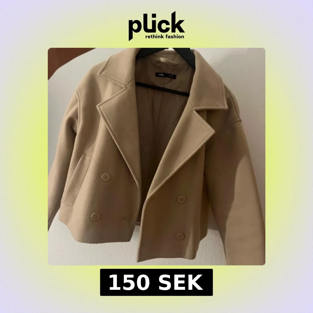 Kort, beige kavajjacka med dubbelknäppning och breda slag. Jackan har två fickor framtill, dekorativa knappar bak och är helfodrad. Perfekt för dig som gillar stilren och trendig look.