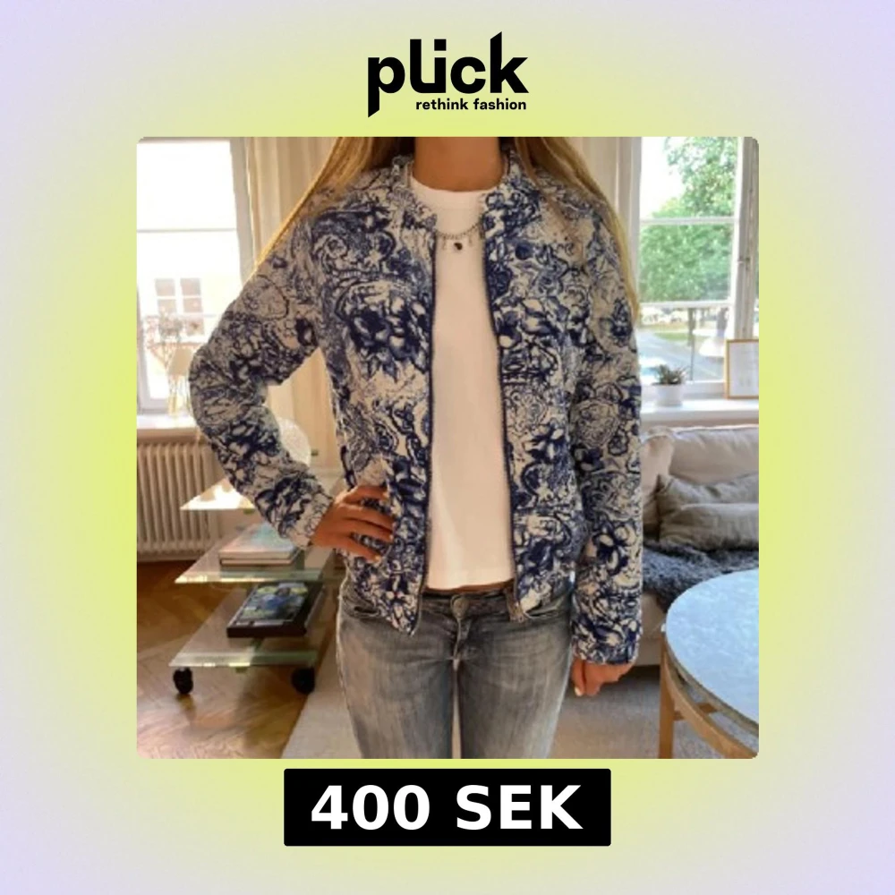 Säljer en blåvit bomberjacka med unikt mönster. Jackan har lång ärm, rund halsringning och stängs med dragkedja framtill. Perfekt för dig som vill sticka ut med en cool och trendig look.