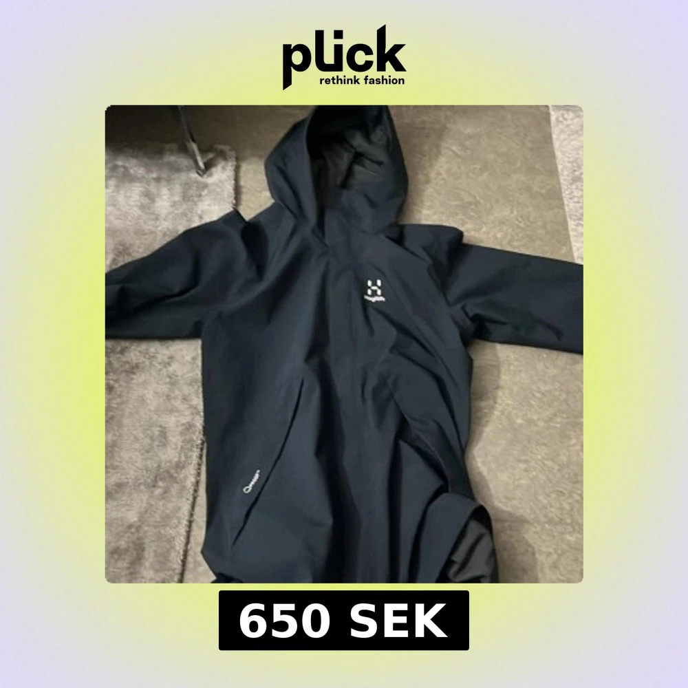 Säljer en svart regnjacka från Haglöfs med huva och dragkedja. Jackan har en stilren design och är perfekt för regniga dagar. Den är tillverkad i ett syntetmaterial som håller dig torr och bekväm. Storleken är S, den är inprincip ny, använd max 2 gånger!