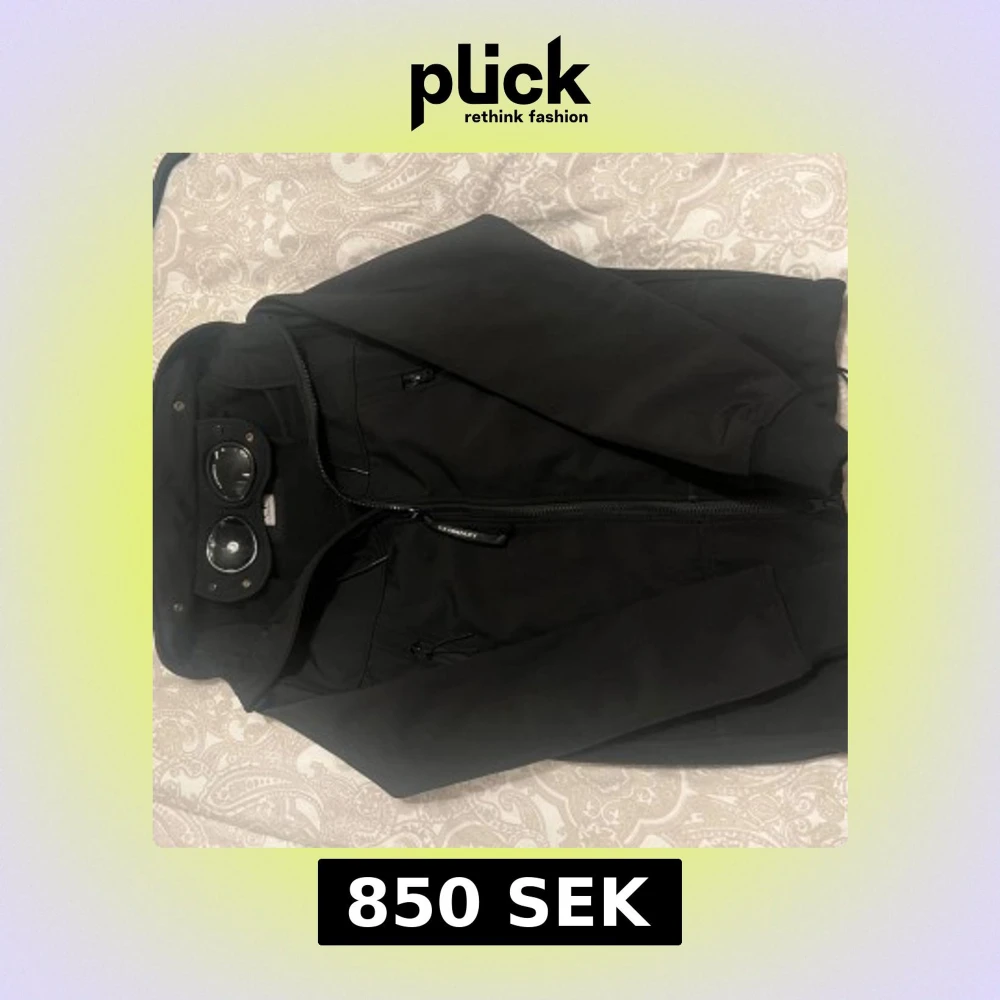Säljer en svart windbreaker från C.P. Company med unika glasögondetaljer på huvan. Jackan har dragkedja framtill och flera praktiska fickor. Perfekt för dig som söker jacka till våren men håller även bra i kylan