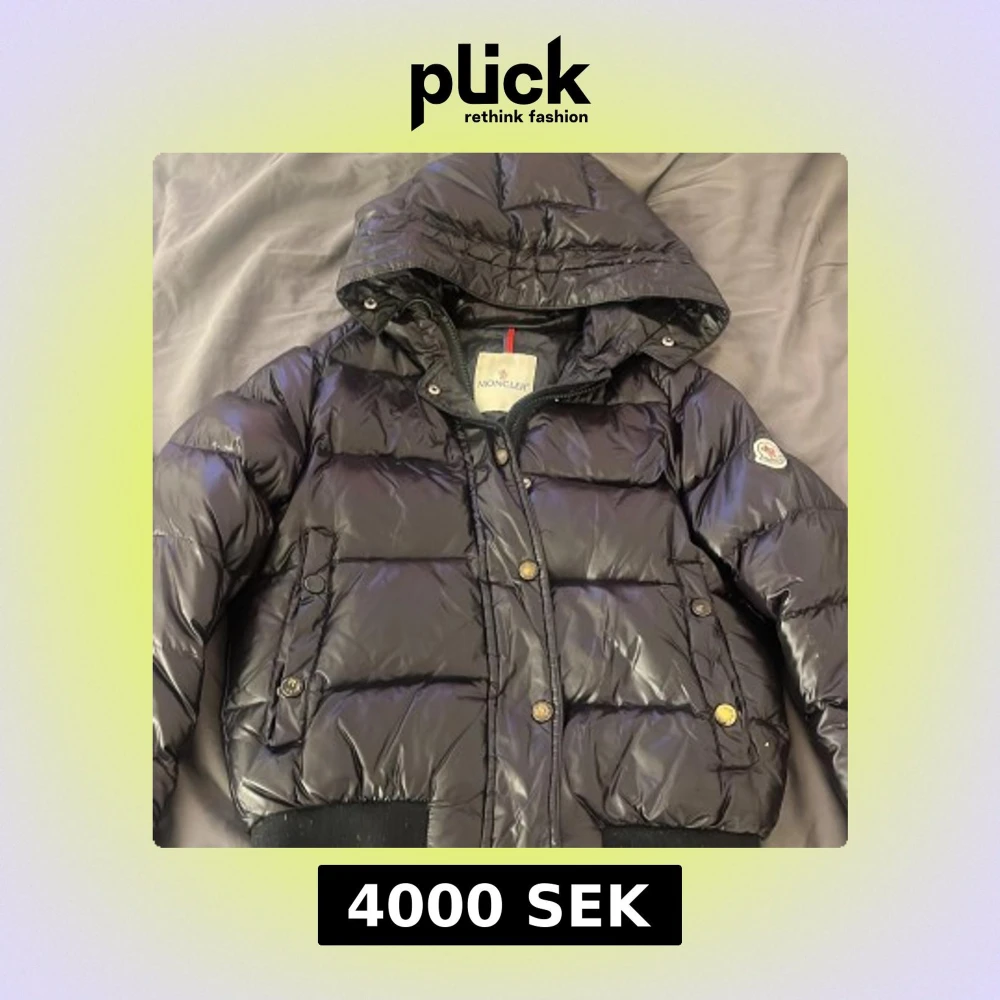Säljer en snygg svart dunjacka från Moncler med huva och dragkedja. Jackan har en glansig yta och ribbade muddar vid ärmslut och nederkant. Perfekt för kyliga dagar! Vet inte om den är äkta köpte den på plick. Storleken står 3 på så den passar xs-s.