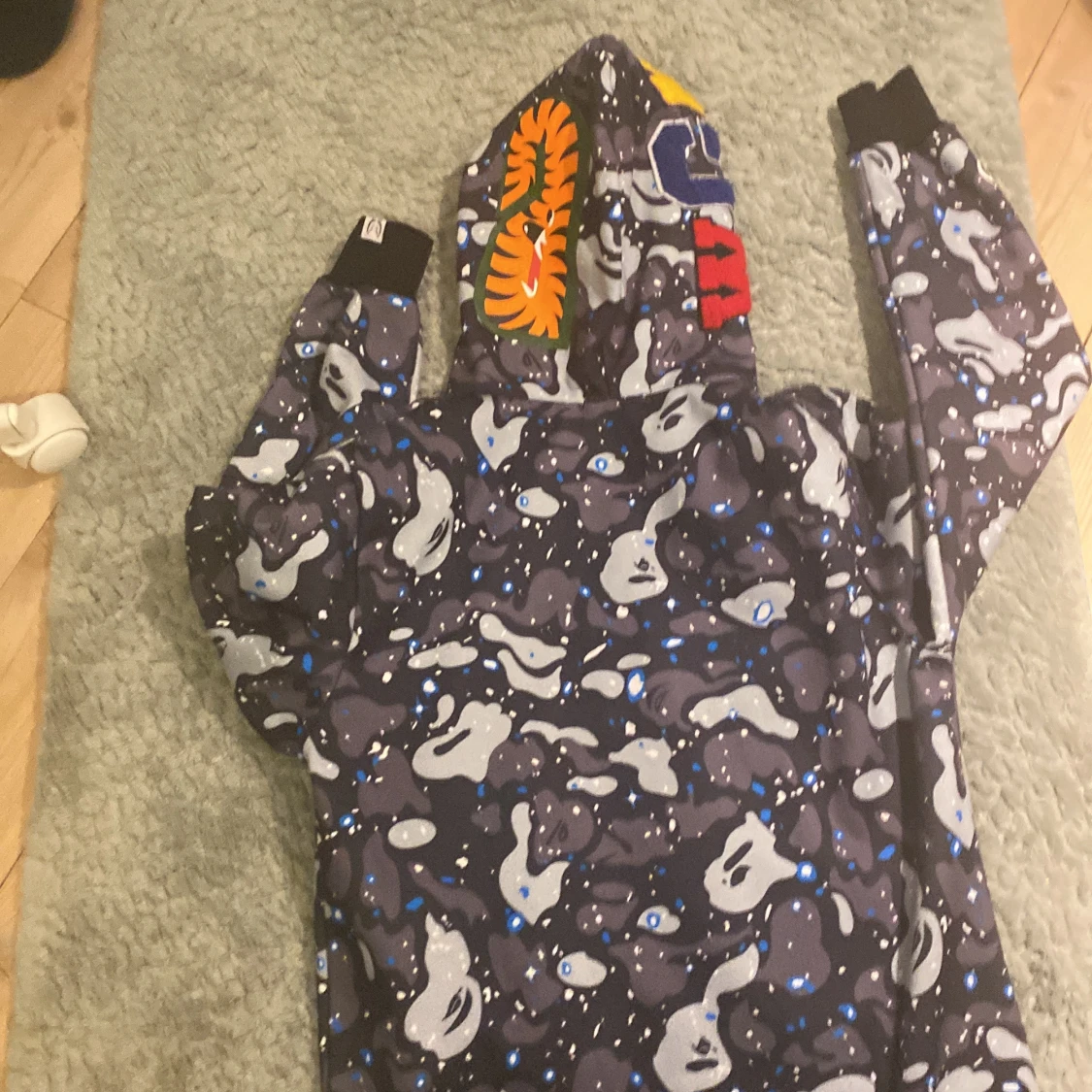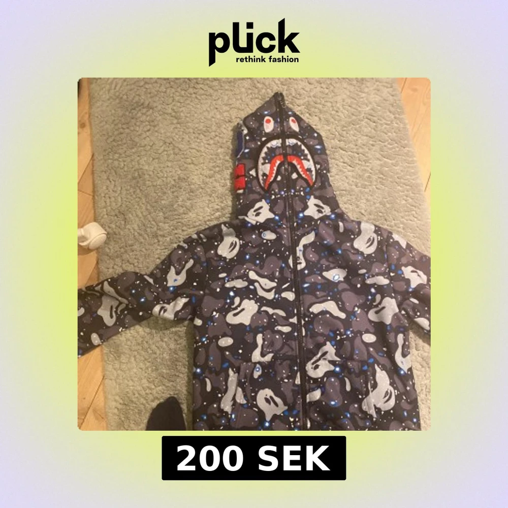 Säljer en cool hoodie med ett unikt hajmotiv på huvan. Jackan har ett grått och svart camouflagemönster med blå detaljer. Den har dragkedja framtill och långa ärmar. Perfekt för dig som vill sticka ut!