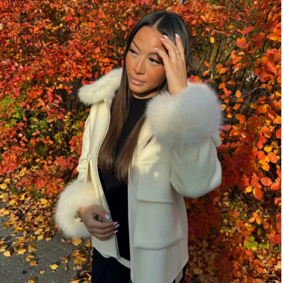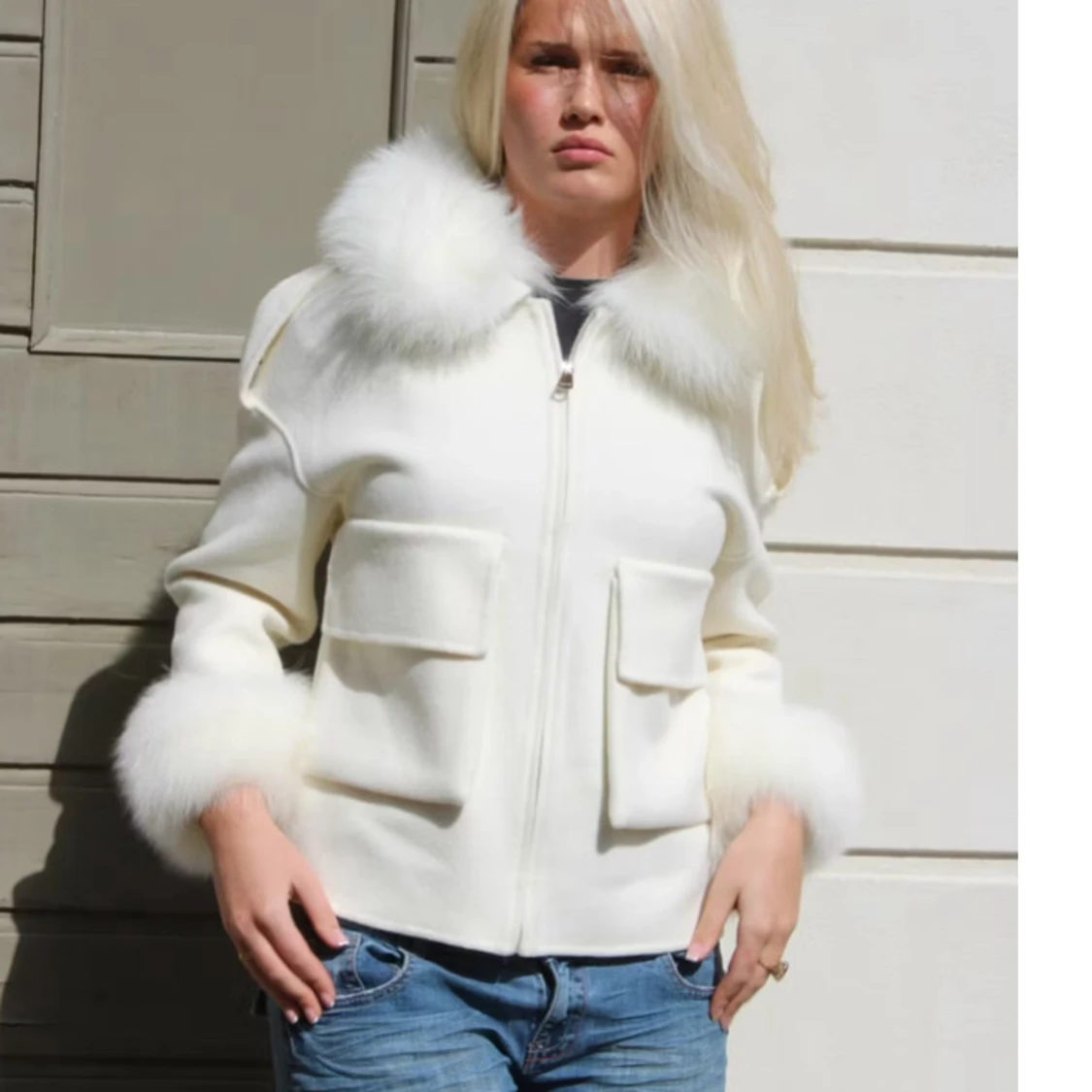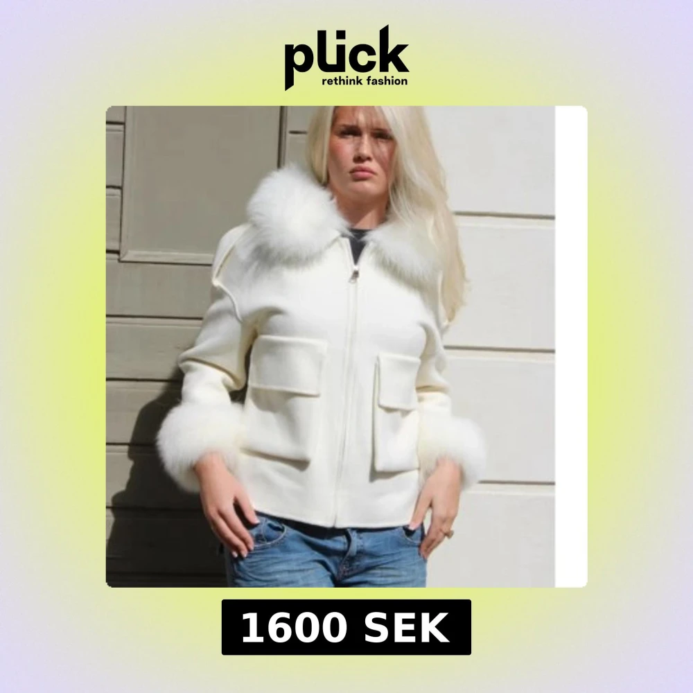 Säljer en vit pälsjacka med fluffig ÄKTA PÄLS vid krage och ärmslut. Jackan har dragkedja framtill, två stora fickor och en rak, lite boxig passform. Perfekt för dig som vill sticka ut med en lyxig och trendig look. FRÅN FURSTOCKHOLM