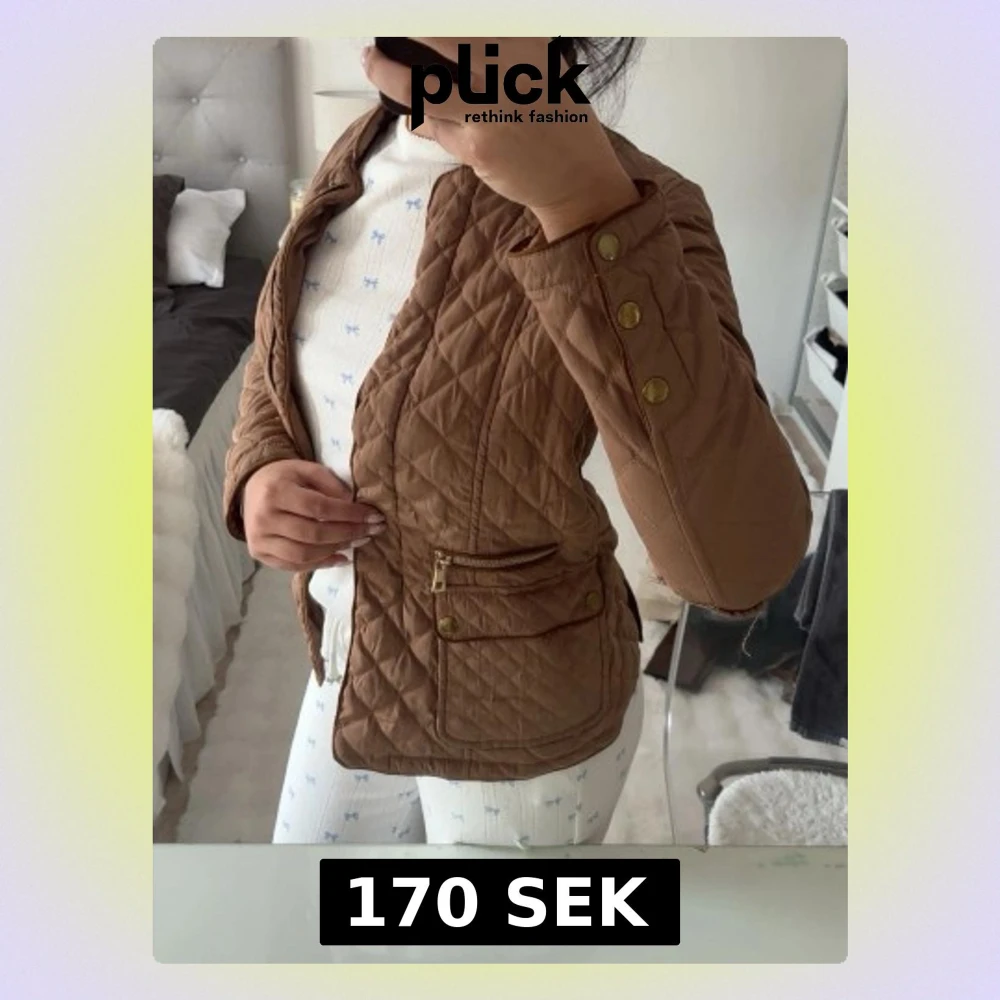 Snygg brun quiltad jacka med guldfärgade knappar och dragkedjor. Jackan har två fickor framtill, ståkrage och figurnära passform. Perfekt för dig som vill ha en stilren och trendig look till vardags.