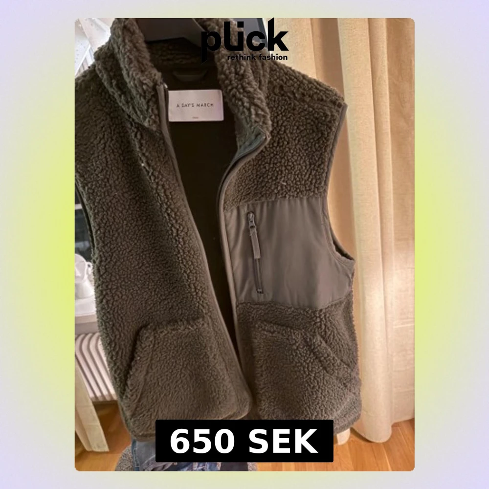 Snygg mörkgrå fleeceväst från A Day's March med hög krage och praktiska fickor. Västen har en dragkedja framtill och en extra ficka med zip på bröstet. Perfekt att slänga över en hoodie för extra värme. Mjuk och fluffig känsla.