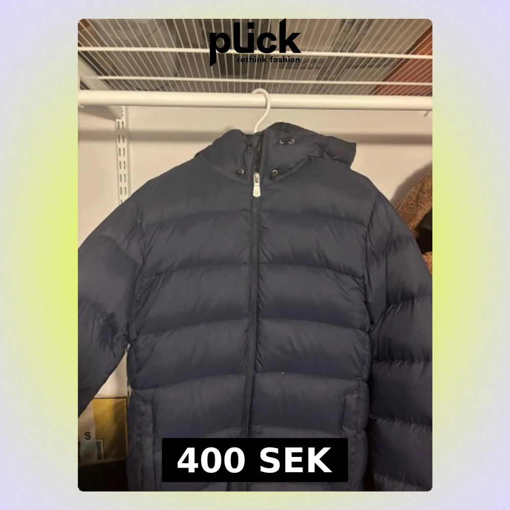 Säljer en mörkblå pufferjacka med huva och dragkedja framtill. Jackan har breda, quiltade sektioner och en clean look utan synliga loggor. Perfekt för kalla dagar och har en snygg, enkel design som funkar till de flesta stilar.