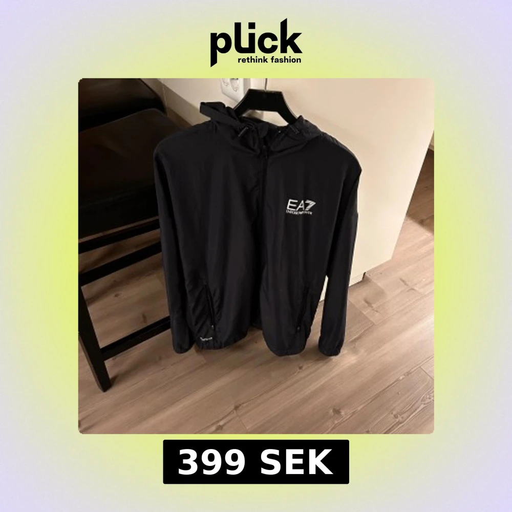 Svart vindjacka från EA7 Emporio Armani med huva och dragkedja framtill. Jackan har vita logotryck på bröstet . FLÄCKAR därav de låga priset