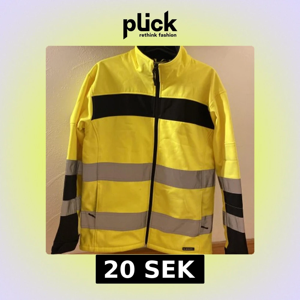Gul och svart vindjacka från Bluewear med reflekterande gråa ränder. Jackan har hel dragkedja framtill, hög krage och två fickor. Perfekt för dig som vill synas och hålla dig skyddad mot vinden. Snygg och funktionell design. Smutsen går nog bort i tvätten men har inte testat. Annars snus det knappt att den är använd.