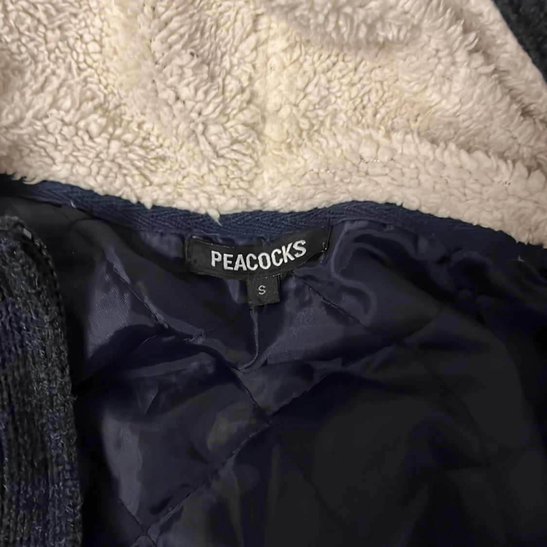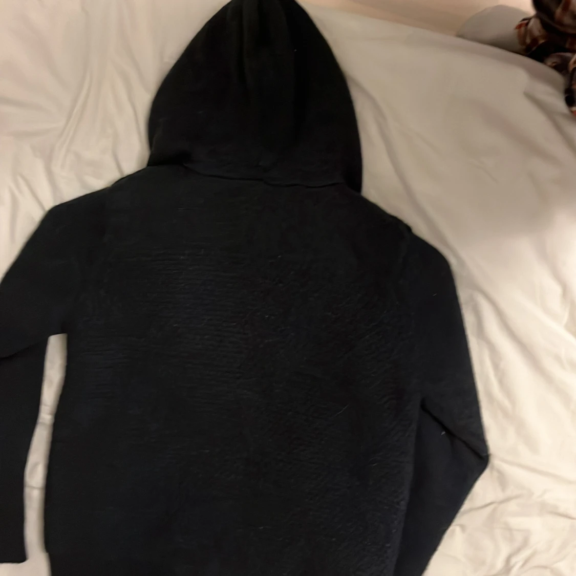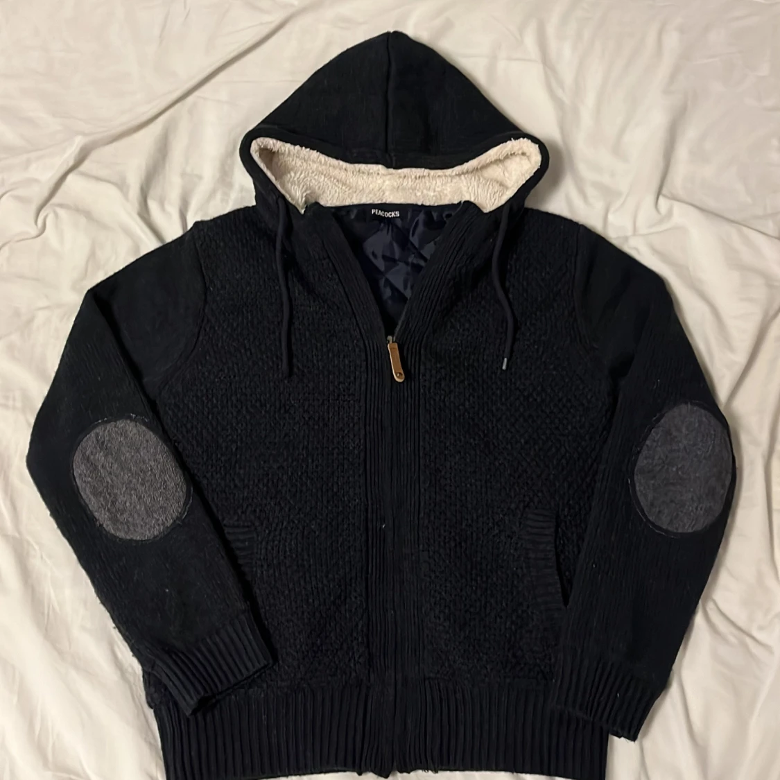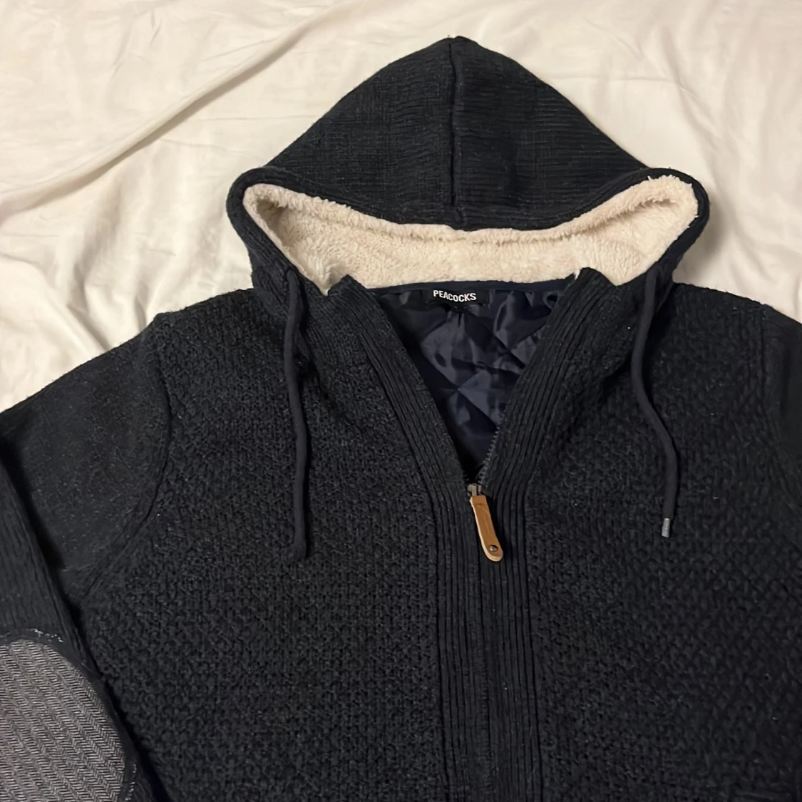 Säljer en svart stickad cardigan från Peacocks med dragkedja och mysigt fleecefoder i luvan. Den har ribbade muddar och snygga grå armbågslappar. Perfekt för kyliga dagar! 🖤