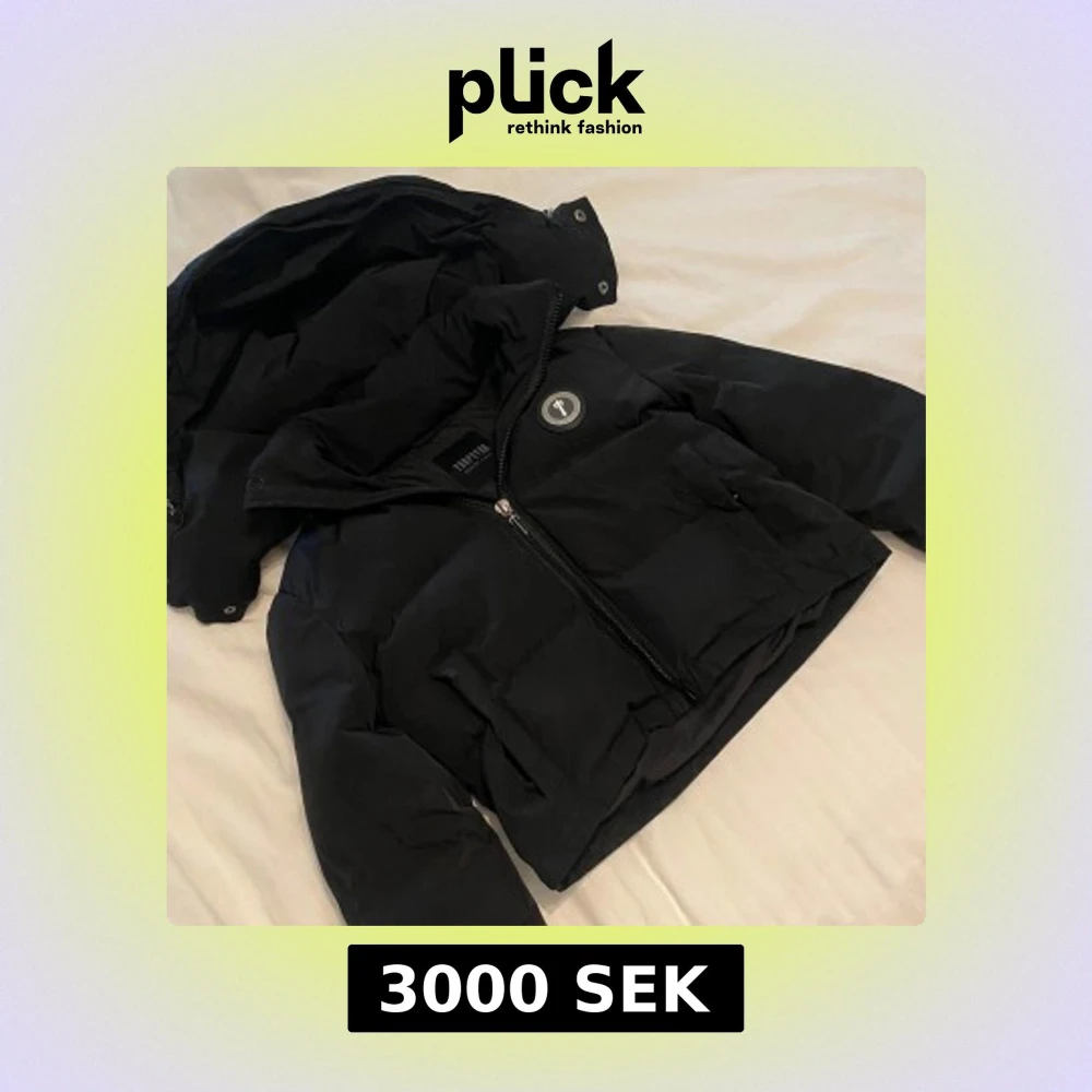 Säljer en svart pufferjacka från Trapstar med dragkedja och huva. Jackan har en cool logga på bröstet och text på ryggen. Perfekt för kyliga dagar när du vill hålla stilen. 🖤