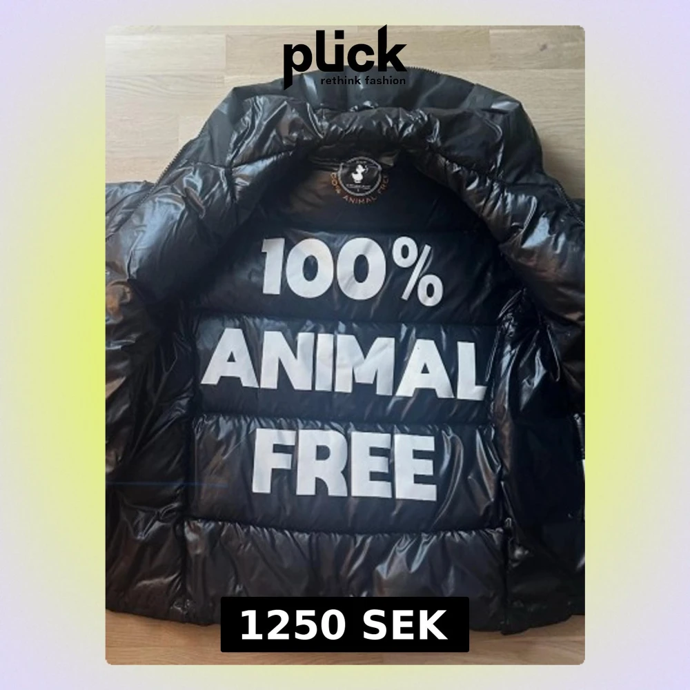 Säljer en svart pufferjacka från Save The Duck med huva och dragkedja. Jackan är quiltad och har två fickor med dragkedja. Insidan har ett stort tryck med texten '100% Animal Free'. Tillverkad i syntetmaterial och perfekt för kalla dagar. Storlek S men passar M.