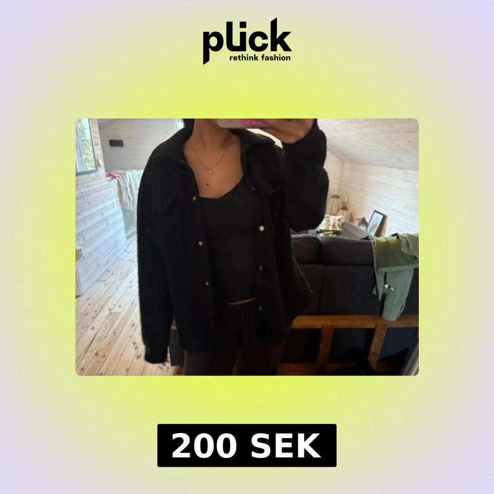 Säljer en svart jacka med klassisk skjortkrage och stora bröstfickor. Jackan har silvriga knappar framtill och är långärmad med en loose passform. Perfekt för dig som gillar mjuka och fluffiga jackor med enkel stil.