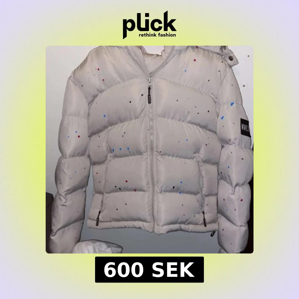 Säljer en vit pufferjacka från NVLTY med coola färgstänk i blått, rött och svart. Jackan har huva, dragkedja och en oversized look. Perfekt för att sticka ut i vinterkylan!