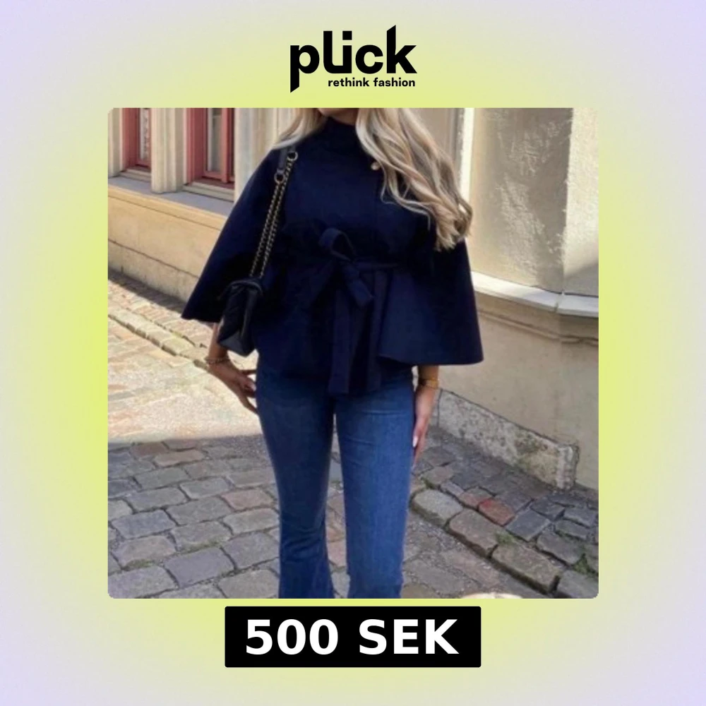Elegant svart kappa med knytband i midjan. Den har en unik design med vida ärmar och hög krage, perfekt för en stilren look.