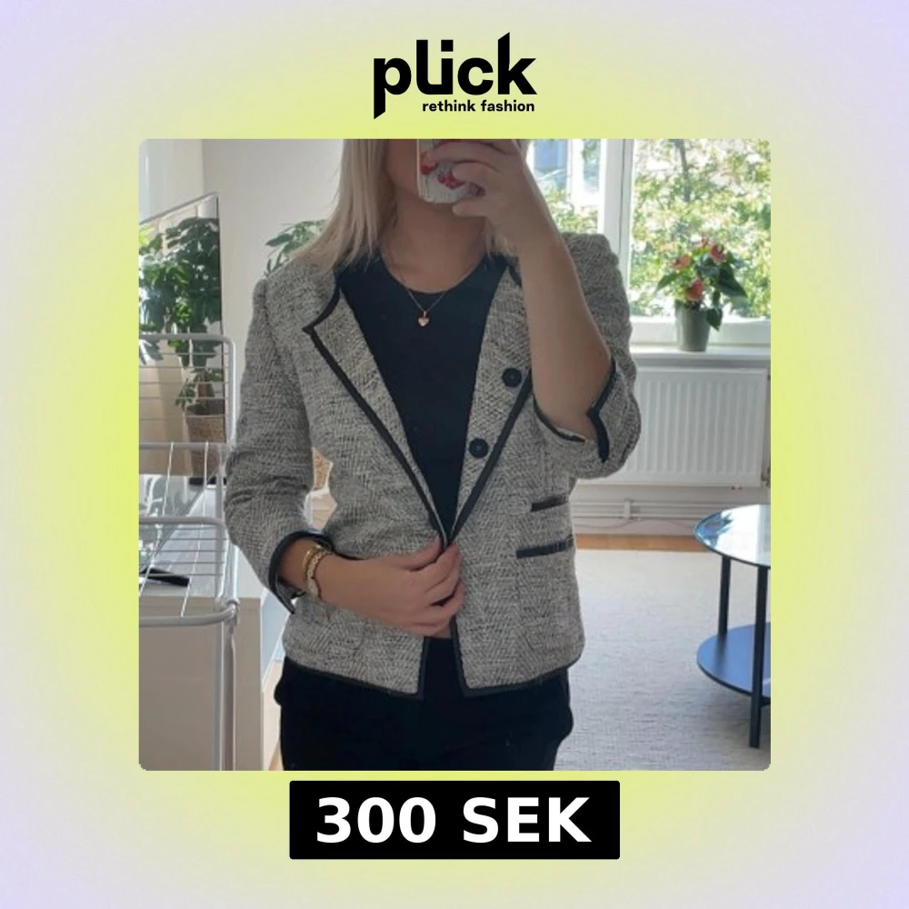 Säljer en snygg gråmelerad kavaj med svarta kanter och dekorativa knappar. Jackan har trekvartsärm och två fickor framtill med svarta detaljer.