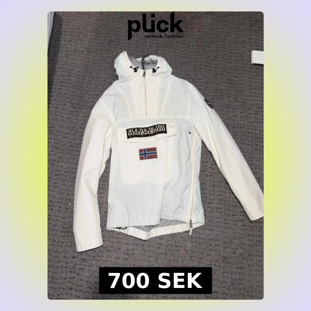 Snygg vit vindjacka från Napapijri med huva, stor magficka med logga och norsk flagga på bröstet. Jackan har dragkedja på sidan och upptill, samt justerbar huva. Perfekt för blåsiga dagar och streetwear-stil.