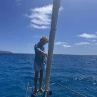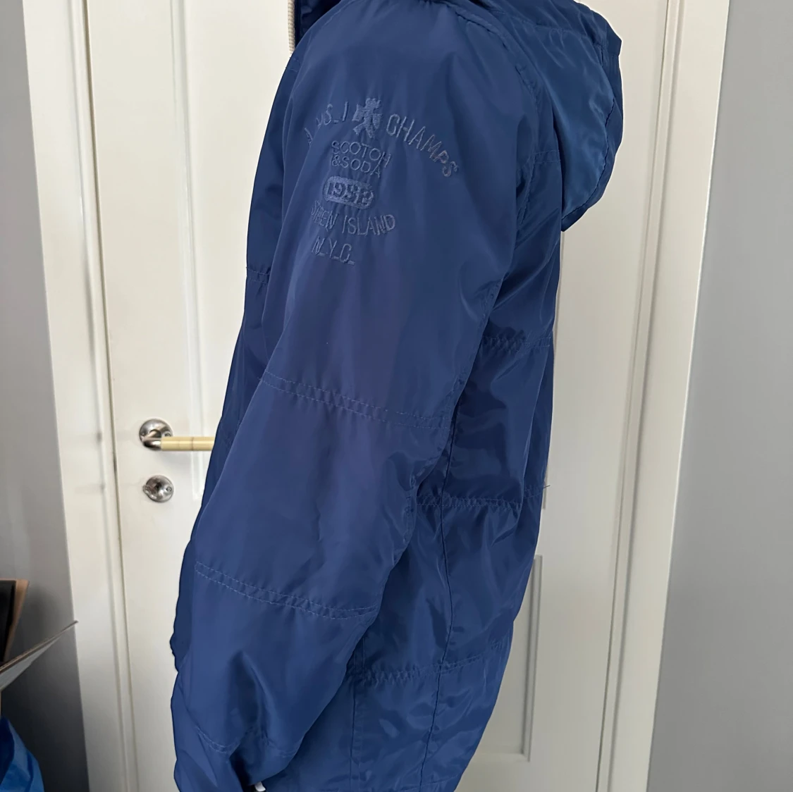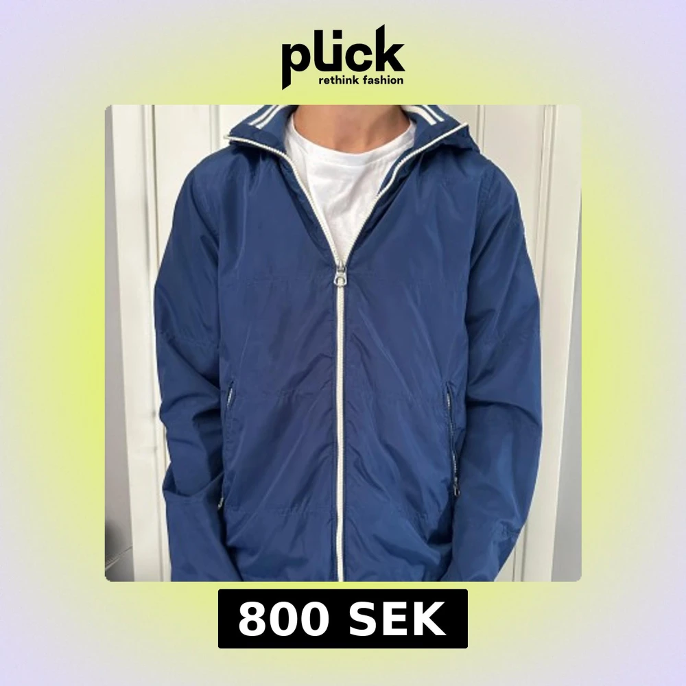 Snygg blå vindjacka med dragkedja och huva. Jackan har ribbade detaljer vid kragen och är perfekt för blåsiga dagar. Två praktiska fickor med dragkedja framtill.