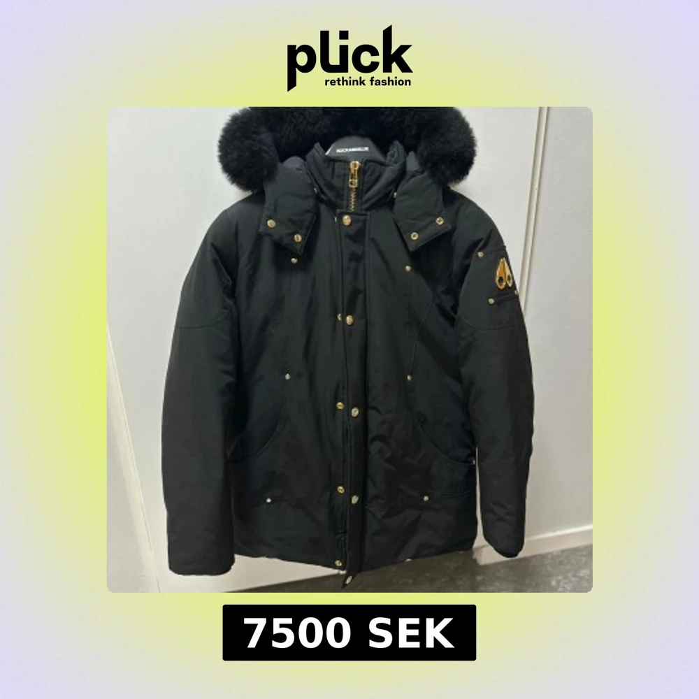 Snygg svart dunjacka från Moose Knuckles med gulddetaljer och en fluffig huva. Jackan har dragkedja och knappar framtill samt ett stilrent emblem på ärmen. Perfekt för kalla dagar.