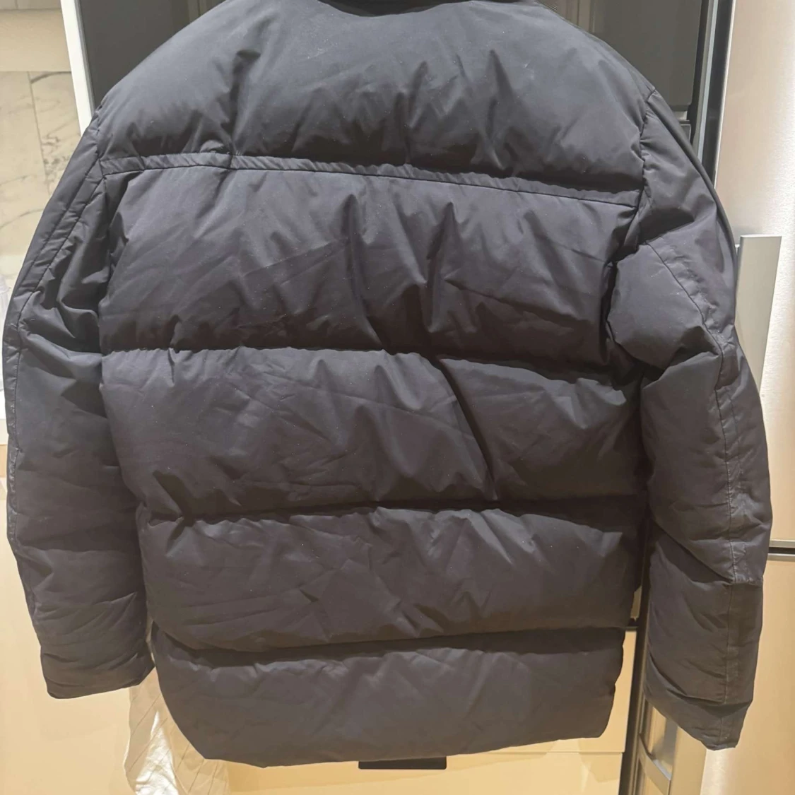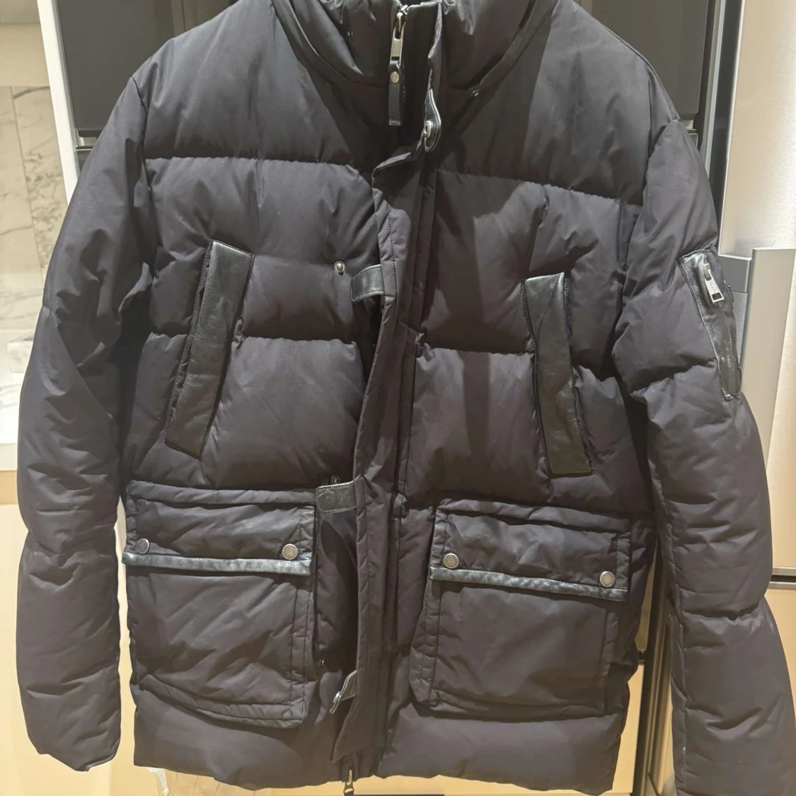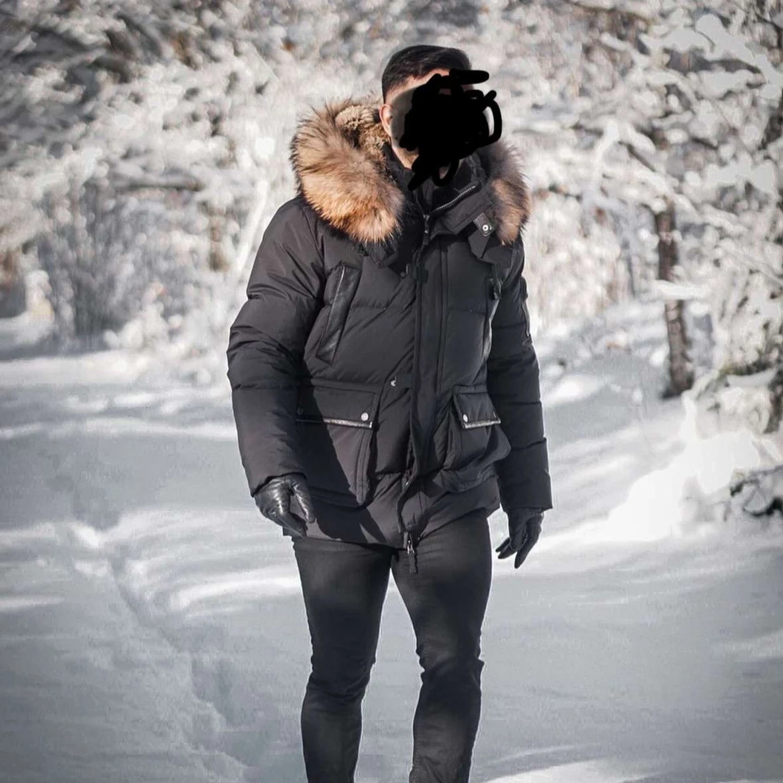 Säljer en svart dunjacka med avtagbar pälsluva. Jackan har flera praktiska fickor med knappar och dragkedja framtill. Perfekt för kalla vinterdagar med sin quiltade design och långa ärmar.