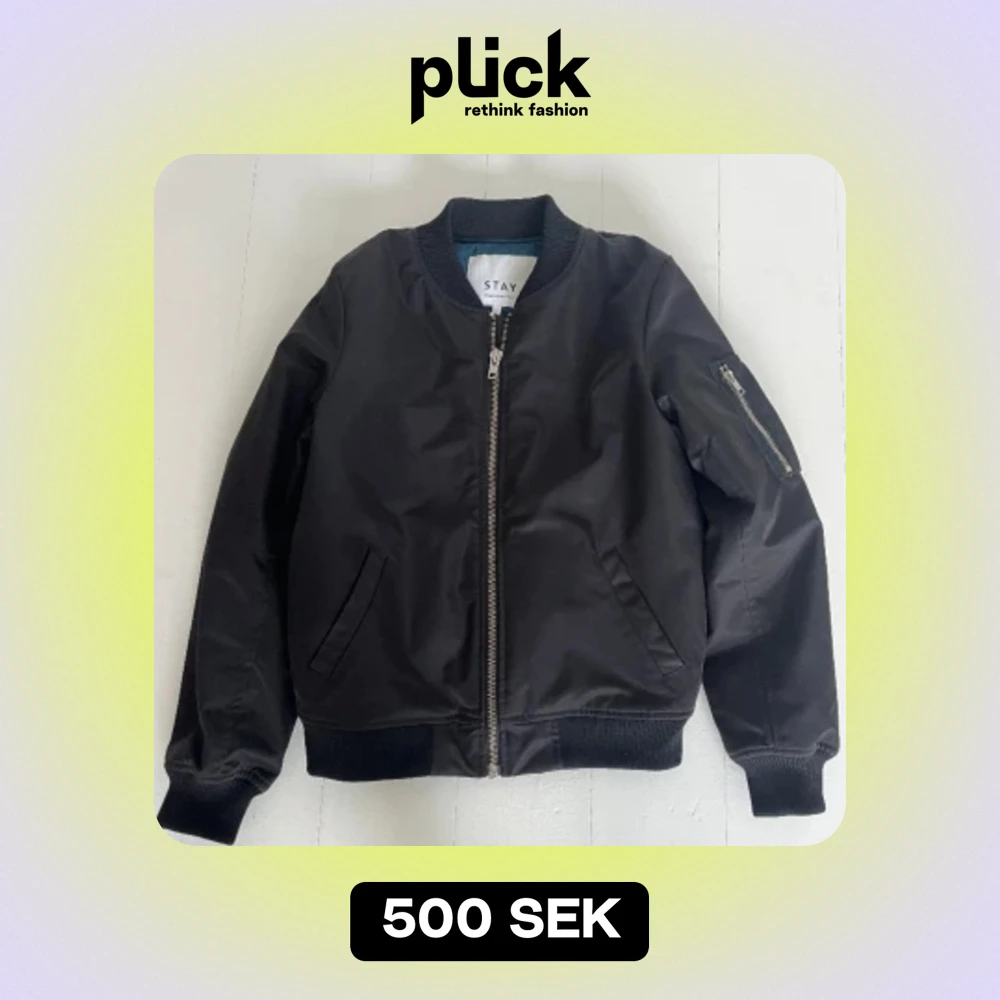 Svart bomberjacka från märket Stay (inköpt på Carlings) i strl S. Muddar vid halsringning, ärmslut och nedtill. Silverfärgad dragkedja mitt fram samt en liten dragkedja på fickan på ärmen. Petrolblått foder. Mycket fint skick.