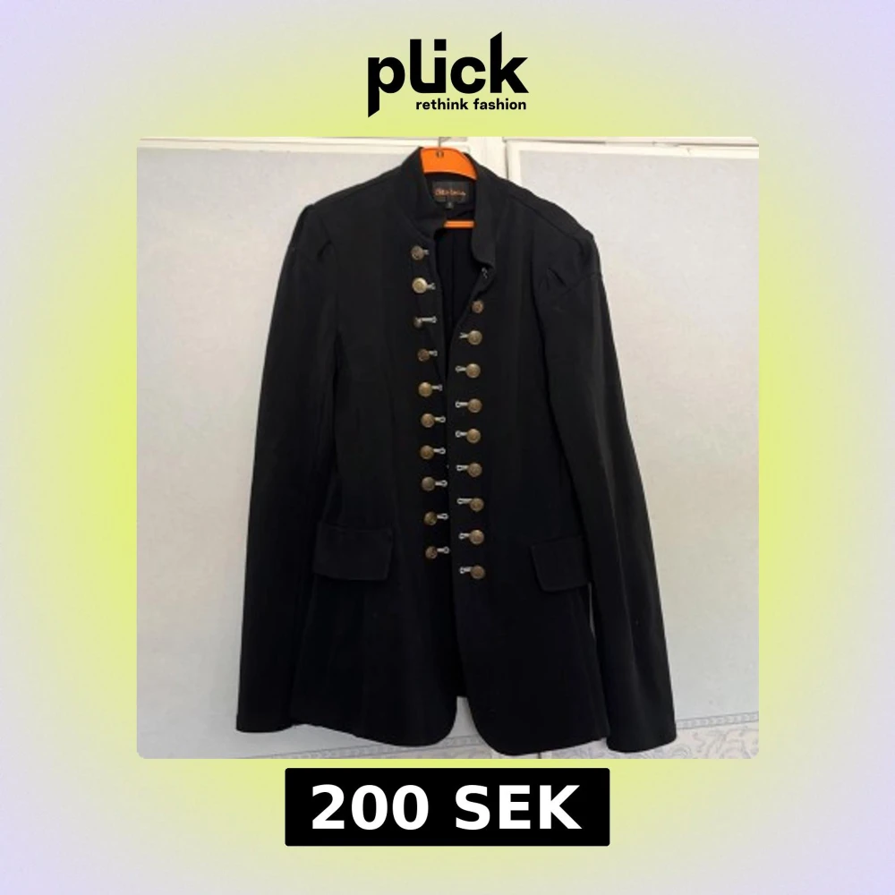 Snygg svart rock från Chica London i storlek S. Jackan har coola dekorativa knappar i två rader framtill och stängs med en hyska vid fjärde knapp nedifrån. Den har lång ärm, med axelvaddar, två dekorationsfickor och en rak, lite längre passform. Perfekt för dig som gillar en stilren och edgy look. Endast använd fåtal gånger. Katt finns i hemmet. Fick inte med bild på axlar typ lite puff se/förstora helbild. 95% bommull 5% elastan 30 grader maskintvätt. Från armhåla till armhåla ca 84 cm, L61cm.