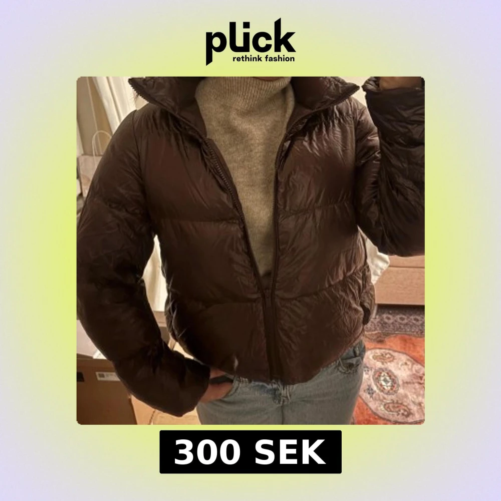 Säljer en brun pufferjacka med glansig finish och hög krage. Jackan har en rak, lite kortare passform och stängs med dragkedja framtill. Perfekt för kyliga dagar och enkel att styla med jeans eller hoodie.