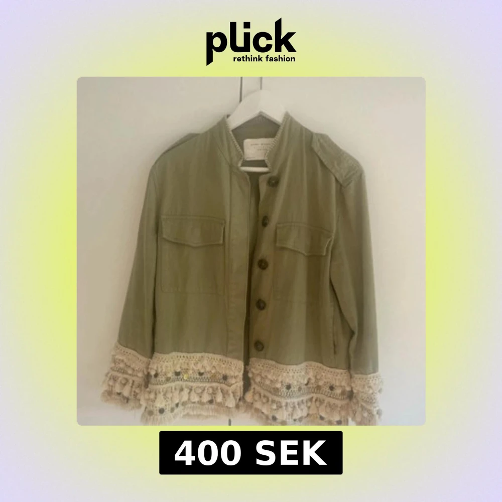 Snygg grön overshirt från Zara med unika virkade detaljer, fransar och guldiga knappar längs nederkanten och ärmsluten. Jackan har två bröstfickor, knäppning framtill och är tillverkad i bomull. Perfekt för dig som vill sticka ut med din stil.