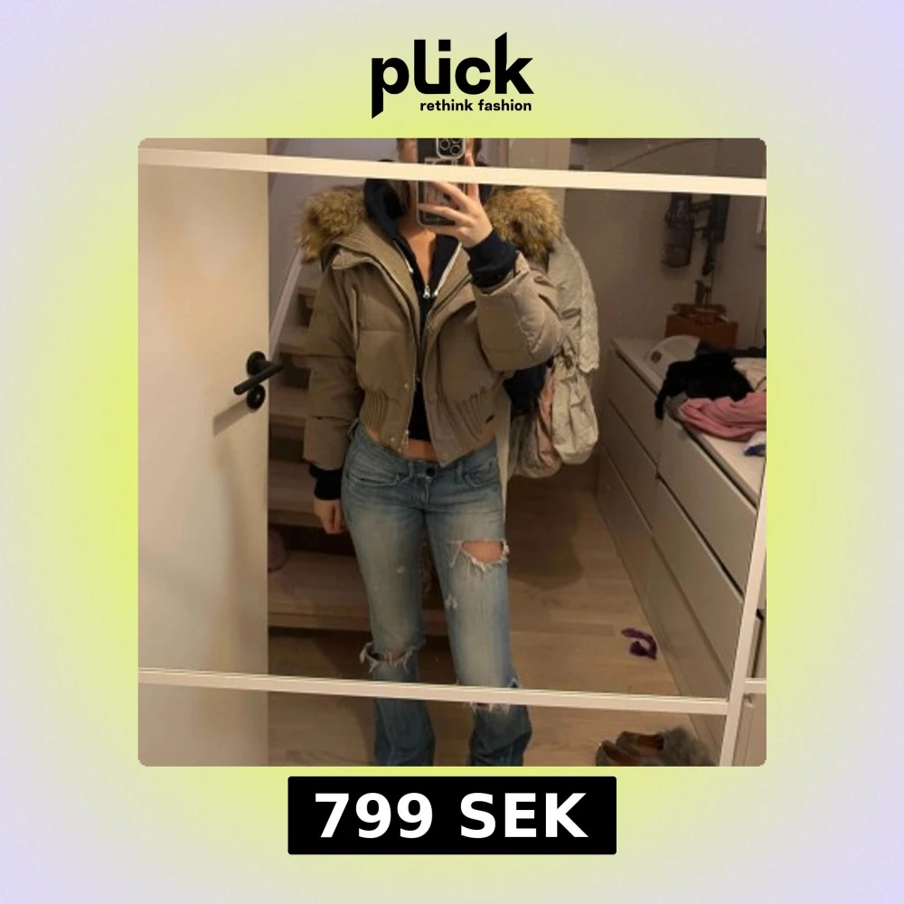 Säljer en beige croppad pufferjacka med stor äkta päls. Jackan har dragkedja och knappar framtill, bred resår i midjan och långa ärmar. Perfekt för kalla dagar när du vill ha en snygg och trendig look.