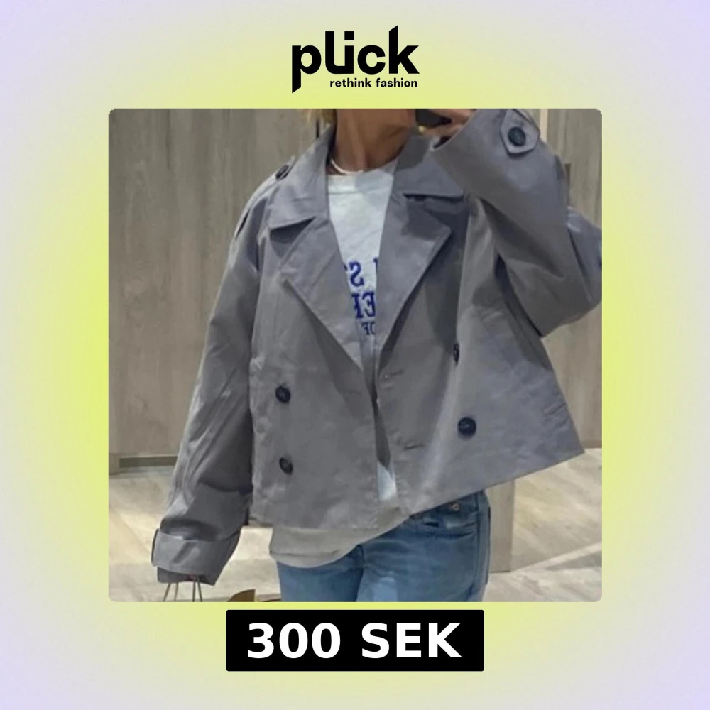 Snygg grå kavaj med stora knappar och en avslappnad passform. Perfekt för en stilren look. Den har långa ärmar och en klassisk krage.