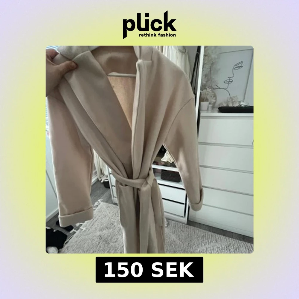 Säljer en stilren beige kappa med bälte. Den har långa ärmar och en klassisk krage. Perfekt för att hålla sig varm och snygg under kyligare dagar.