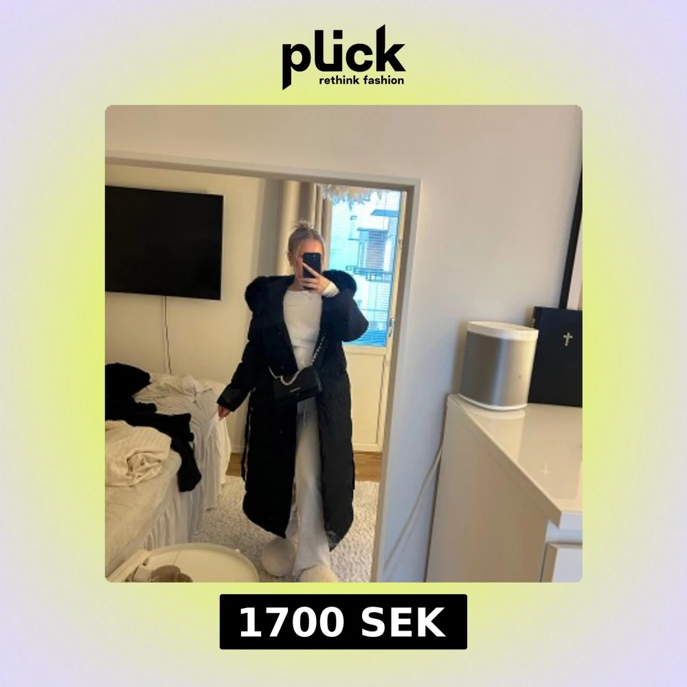 Snygg och varm svart lång dunjacka med en fluffig pälskrage. Perfekt för kalla vinterdagar. Jackan har knappar så man kan stänga den och ett snöre man kan knyta som man vill runt midjan. Använd en gång, i helt nytt skick och köpt för 2000:-, Inge defekter!