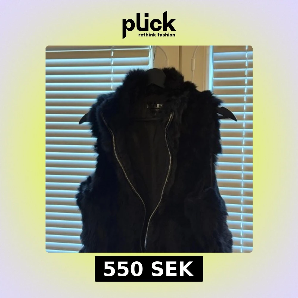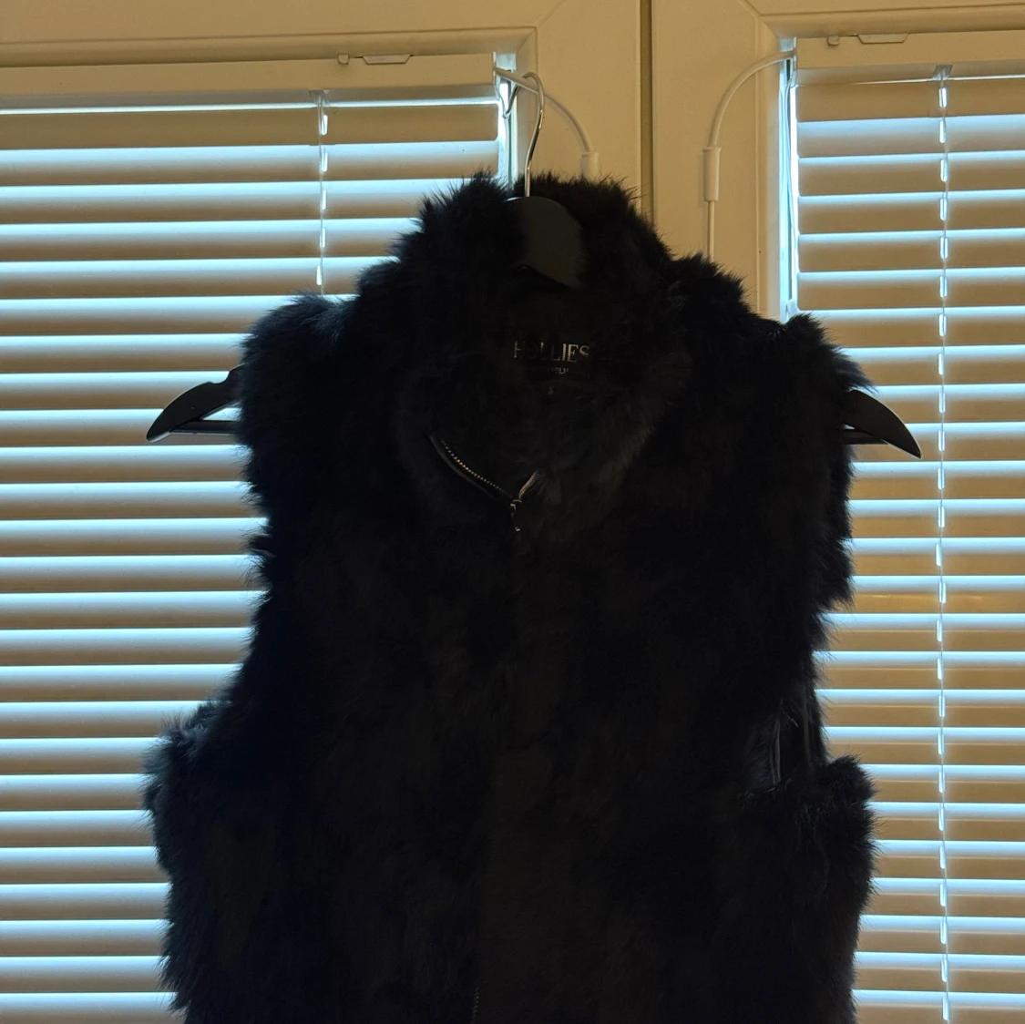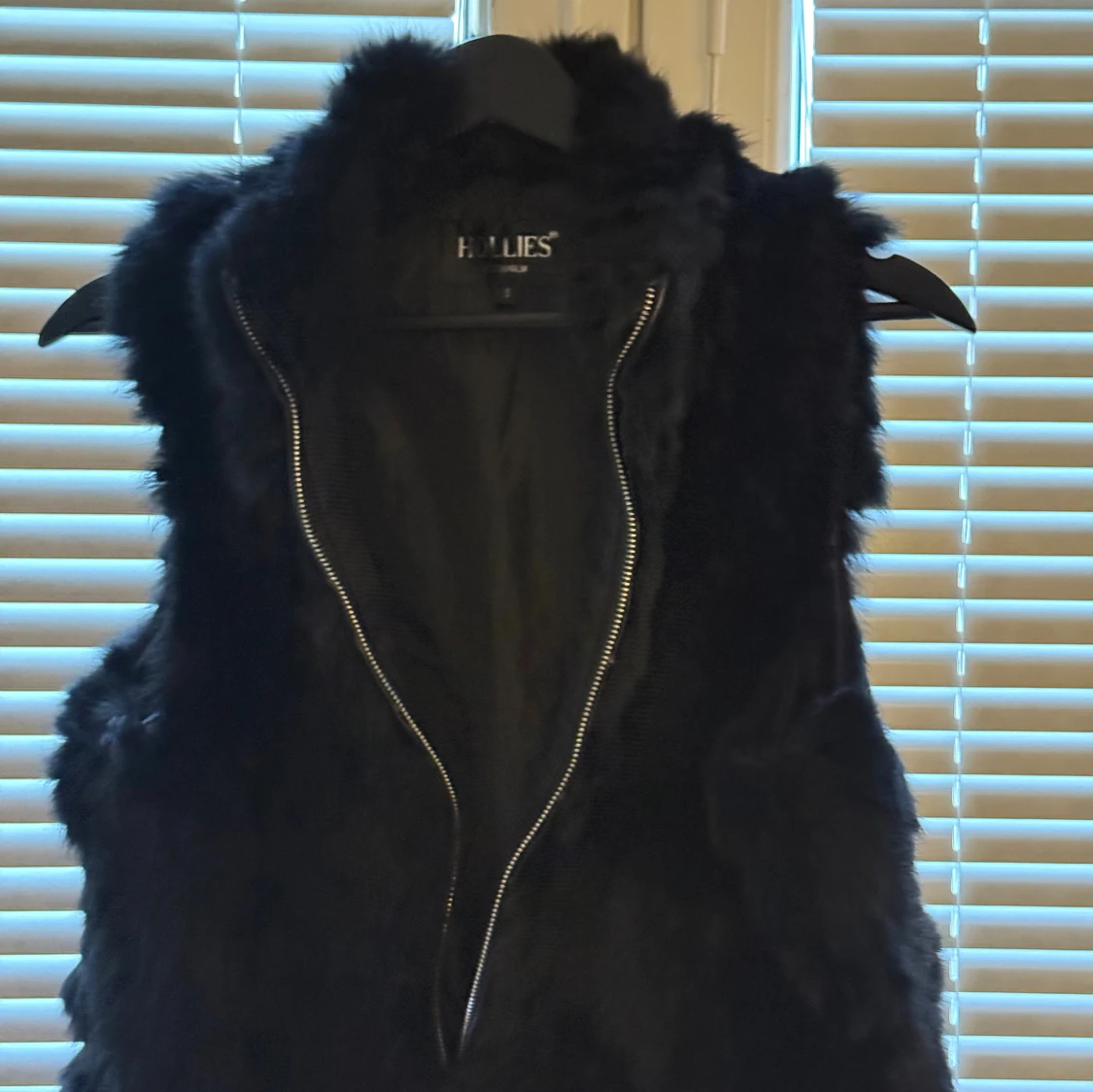 Svart pälsväst från Hollies i storlek S. Västen har fluffig pälslook och en snygg dragkedja framtill. Perfekt för att addera lite edge till din outfit. Fodrad insida och klassisk krage. Enkelt att matcha med jeans eller skinnbyxor.