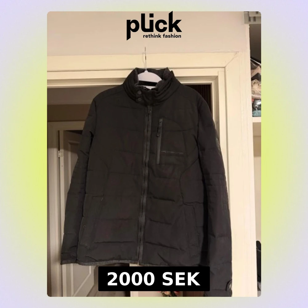 Säljer en svart pufferjacka från Porsche med hög krage, diskret Porsche-logga på bröstet och patch på ärmen. Jackan har dragkedja framtill, bröstficka med dragkedja och två sidofickor. Perfekt för kalla dagar och riktigt snygg streetstil.