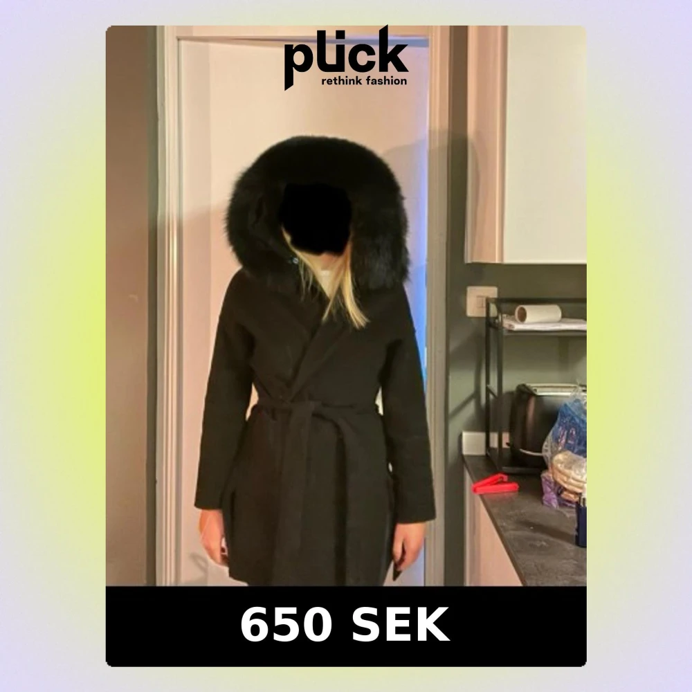 Säljer en svart kappa med stor, fluffig pälshuva och knytskärp i midjan. Jackan har en omlottmodell och är långärmad, perfekt för kalla dagar. Stilen är clean och elegant med en oversized känsla på huvan.