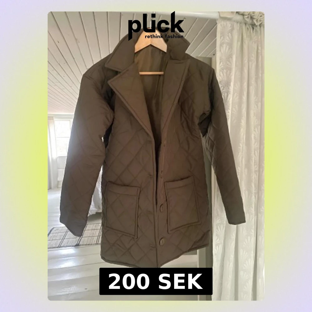 Säljer en olivgrön quiltad rock med stora framfickor och knappar. Jackan har en klassisk krage och långärmade ärmar. Perfekt för dig som gillar stilren och enkel design med lite edge. Passar dig som vill ha en jacka med lite längre modell.