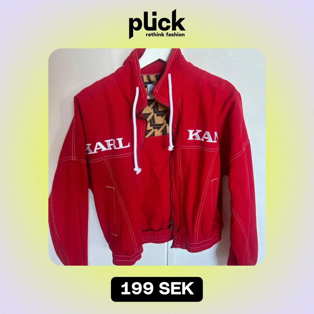 Säljer en snygg röd jacka från Karl Kani i storlek S. Jackan har en cool design med vita snören och broderad text. Den har en dragkedja framtill och ett mönstrat foder. Perfekt för höst och vår!