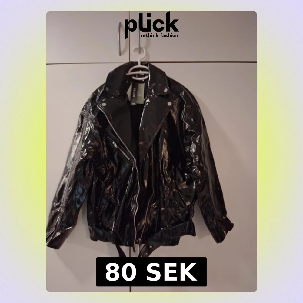 Säljer en svart, glansig vegan skinnjacka från Divided i storlek S. Jackan har coola detaljer som snedställd dragkedja, bred krage och bälte nedtill. Perfekt för dig som vill ha en edgy look med mycket attityd.