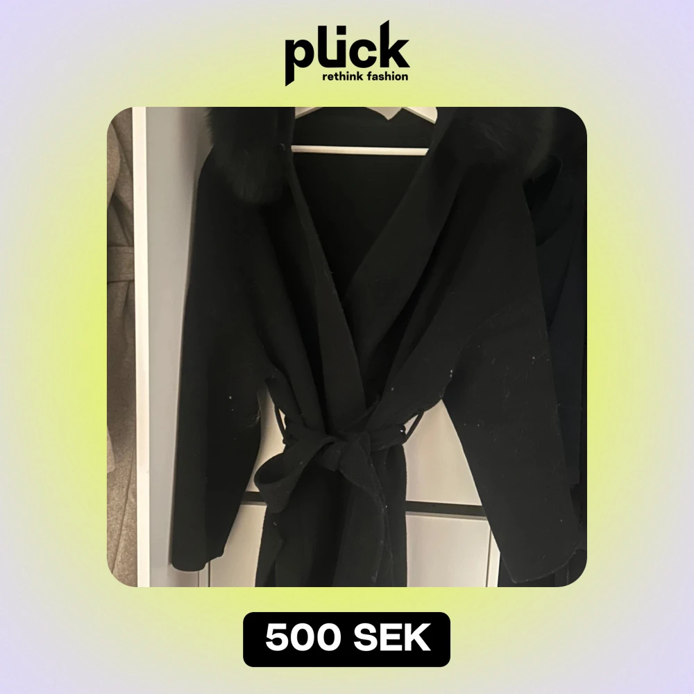 Säljer en elegant svart kappa med pälsdetaljer på kragen (fuskpäls). Den har ett knytbälte i midjan för en snygg passform. Perfekt för kyliga höst- och vinterdagar. Kappan är långärmad och ger en stilren look.