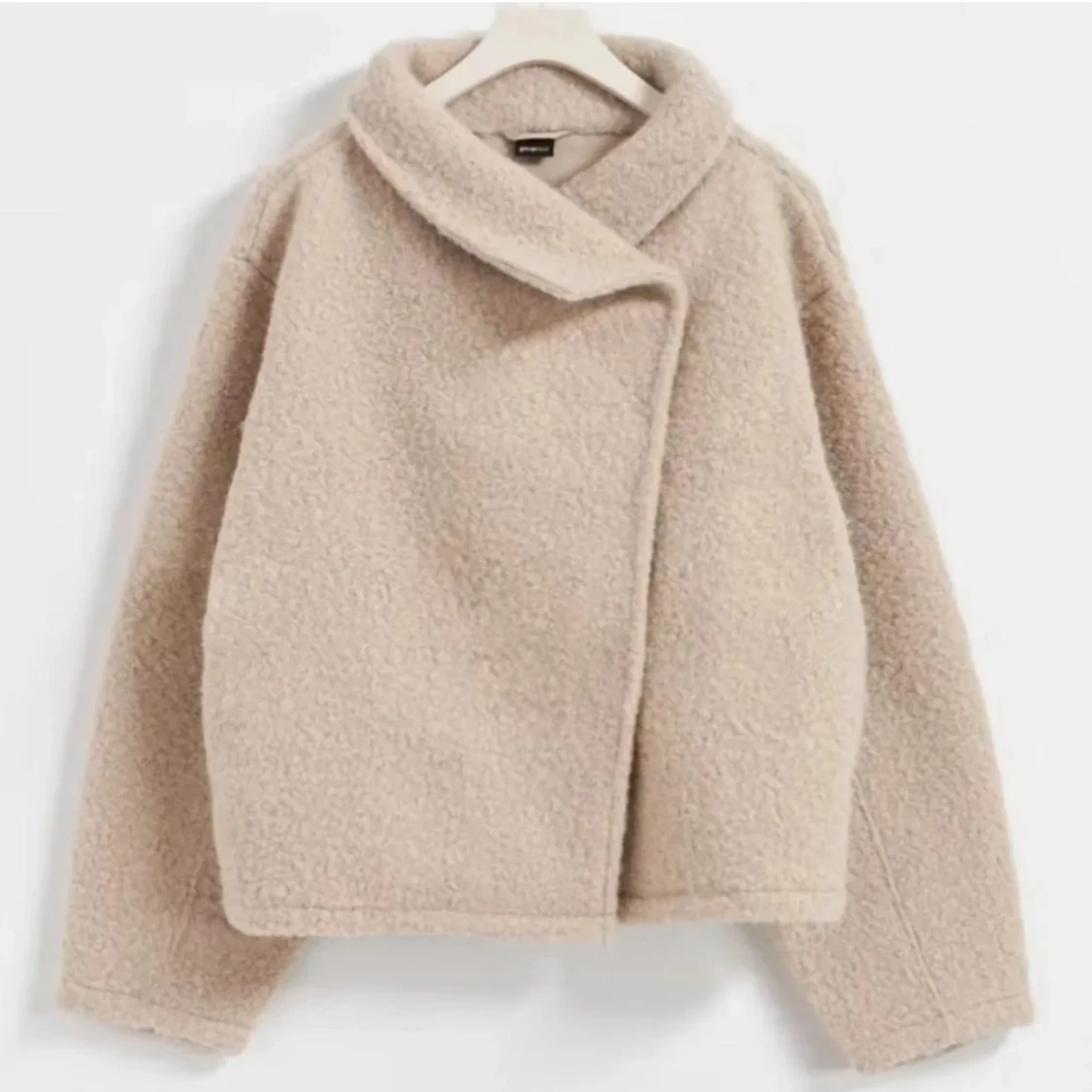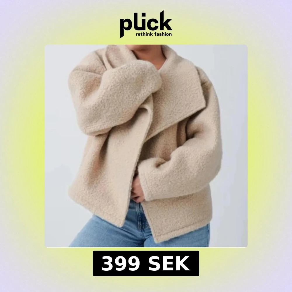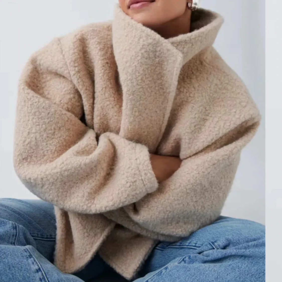 Supermjuk och fluffig teddyjacka i beige med oversized passform och bred, asymmetrisk krage. Jackan har långa ärmar och är perfekt för dig som vill ha en mysig och trendig look.