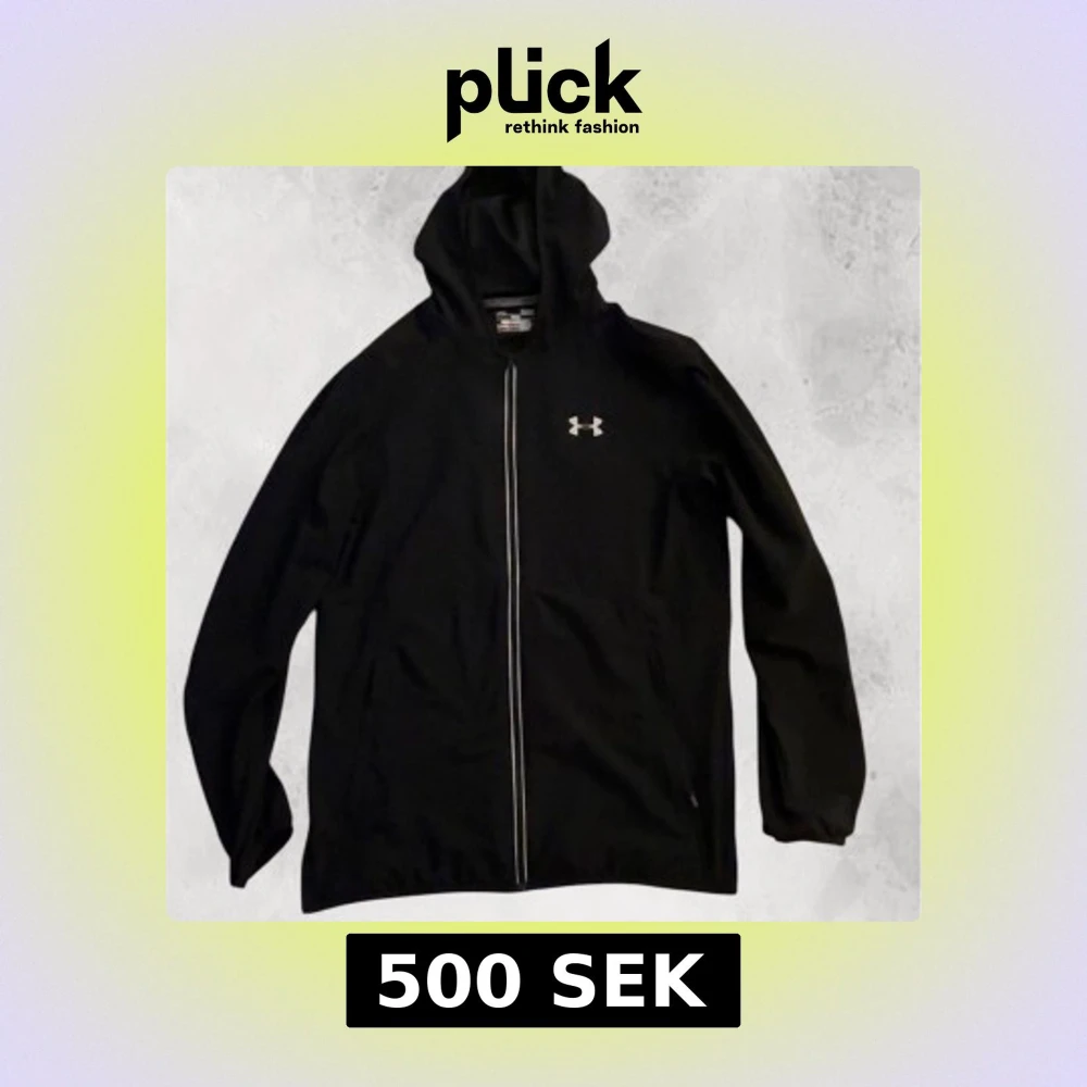 Säljer en svart träningsjacka från Under Armour med dragkedja och huva. Jackan har långa ärmar och reflekterande detaljer längs dragkedjan. Perfekt för löpning och andra utomhusaktiviteter.