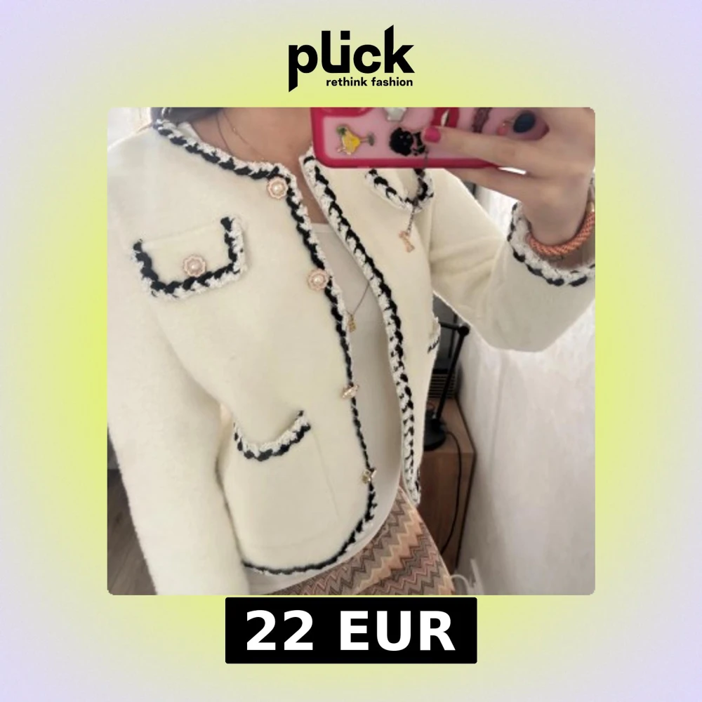 Superfin vit cardigan jacka med svarta och vita virkade kanter och dekorativa pärlknappar. Jackan har fyra fickor framtill och är långärmad. Den är mjuk och har en klassisk, elegant look som passar perfekt till jeans eller kjol.