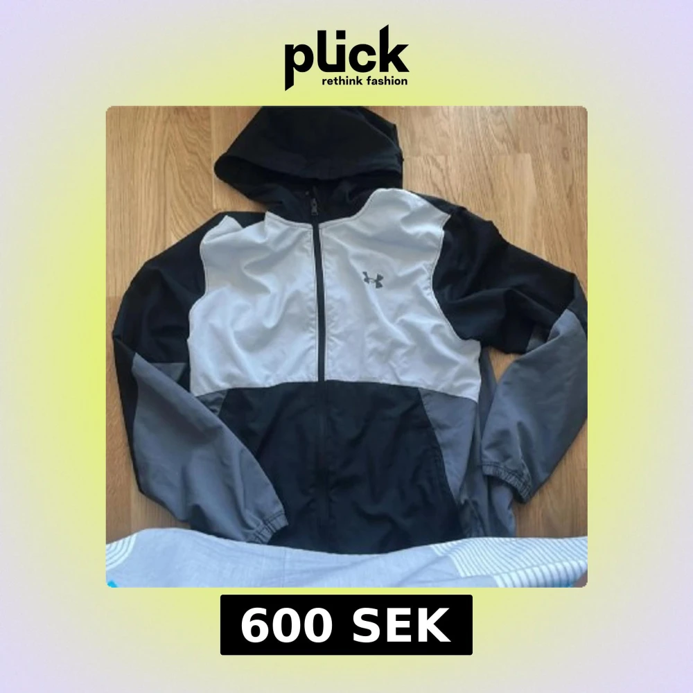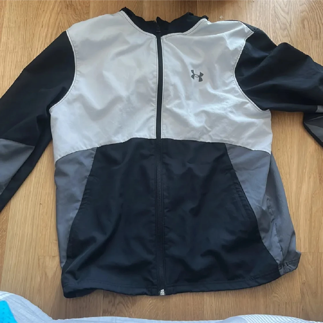 Snygg vindjacka från Under Armour i svart, grått och ljusgrått. Jackan har huva, hel dragkedja och sportig design med logga på bröstet. Perfekt för utomhusaktiviteter och träning. Långärmad med elastiska muddar och lätt material som andas.