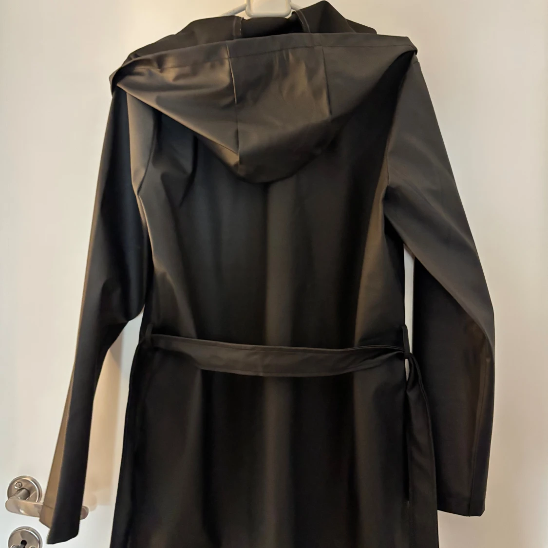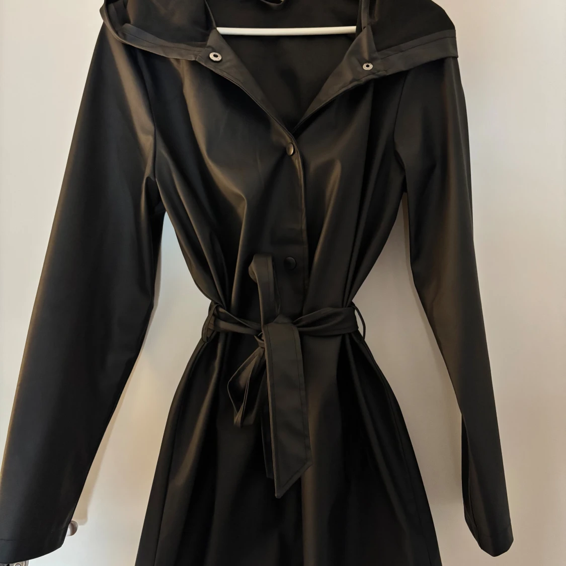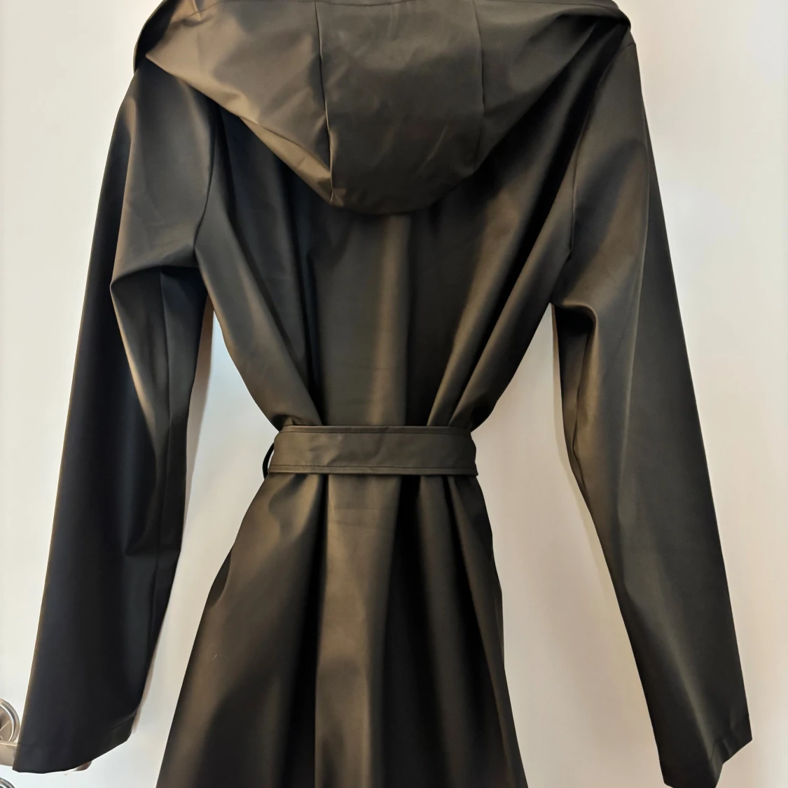 Svart regnjacka i syntetmaterial med huva, knappar framtill och knytskärp i midjan. Jackan har långa ärmar och en stilren, minimalistisk look. Perfekt för regniga dagar när du vill hålla stilen enkel och clean.