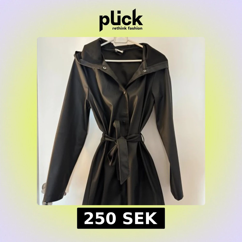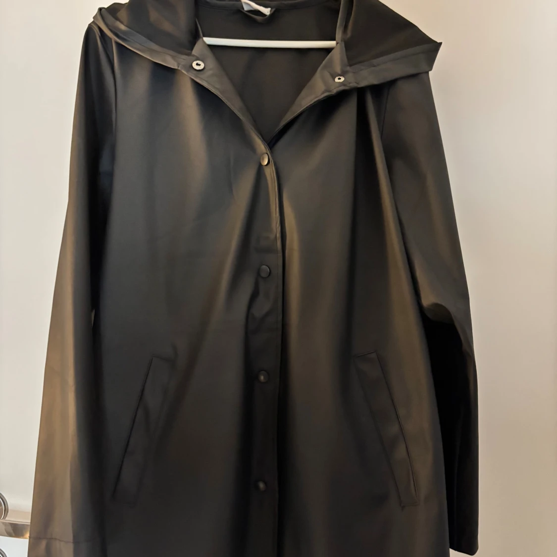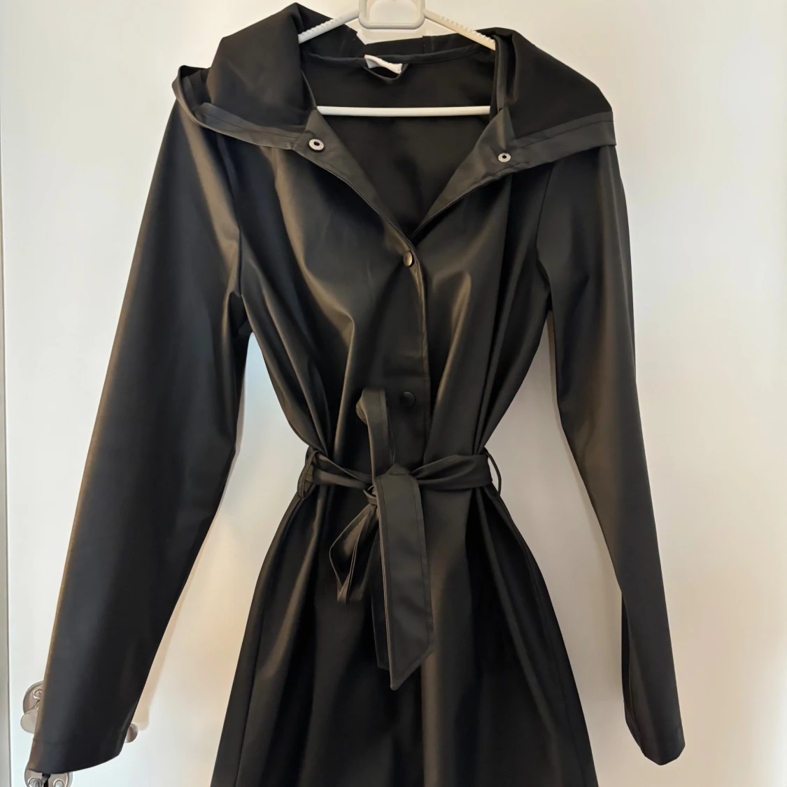 Svart regnjacka i syntetmaterial med huva, knappar framtill och knytskärp i midjan. Jackan har långa ärmar och en stilren, minimalistisk look. Perfekt för regniga dagar när du vill hålla stilen enkel och clean.