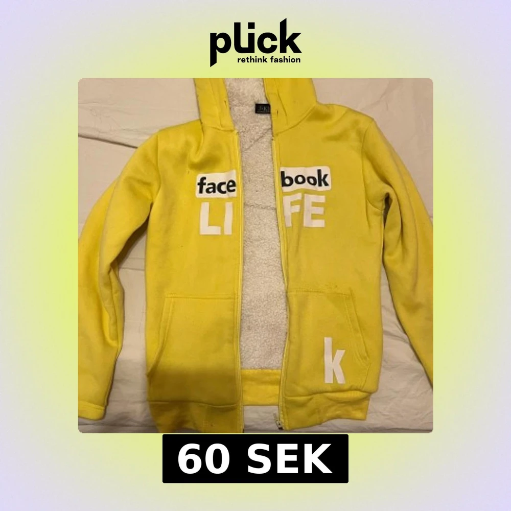 Säljer en gul hoodie med texten 'facebook LIFE' på framsidan. Den har en dragkedja och är fodrad med mjukt, vitt material. Perfekt för en avslappnad stil. Super varm