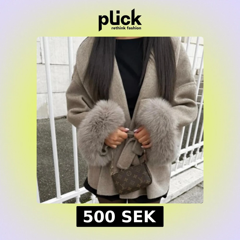 Snygg beige kappa med pälsdetaljer vid ärmsluten och knytband i midjan. Jackan har en loose passform och ger en lyxig vibe med sina breda ärmar och mjuka material. Perfekt för dig som vill sticka ut med en trendig och elegant look. pälsen är inte äkta , helt ny