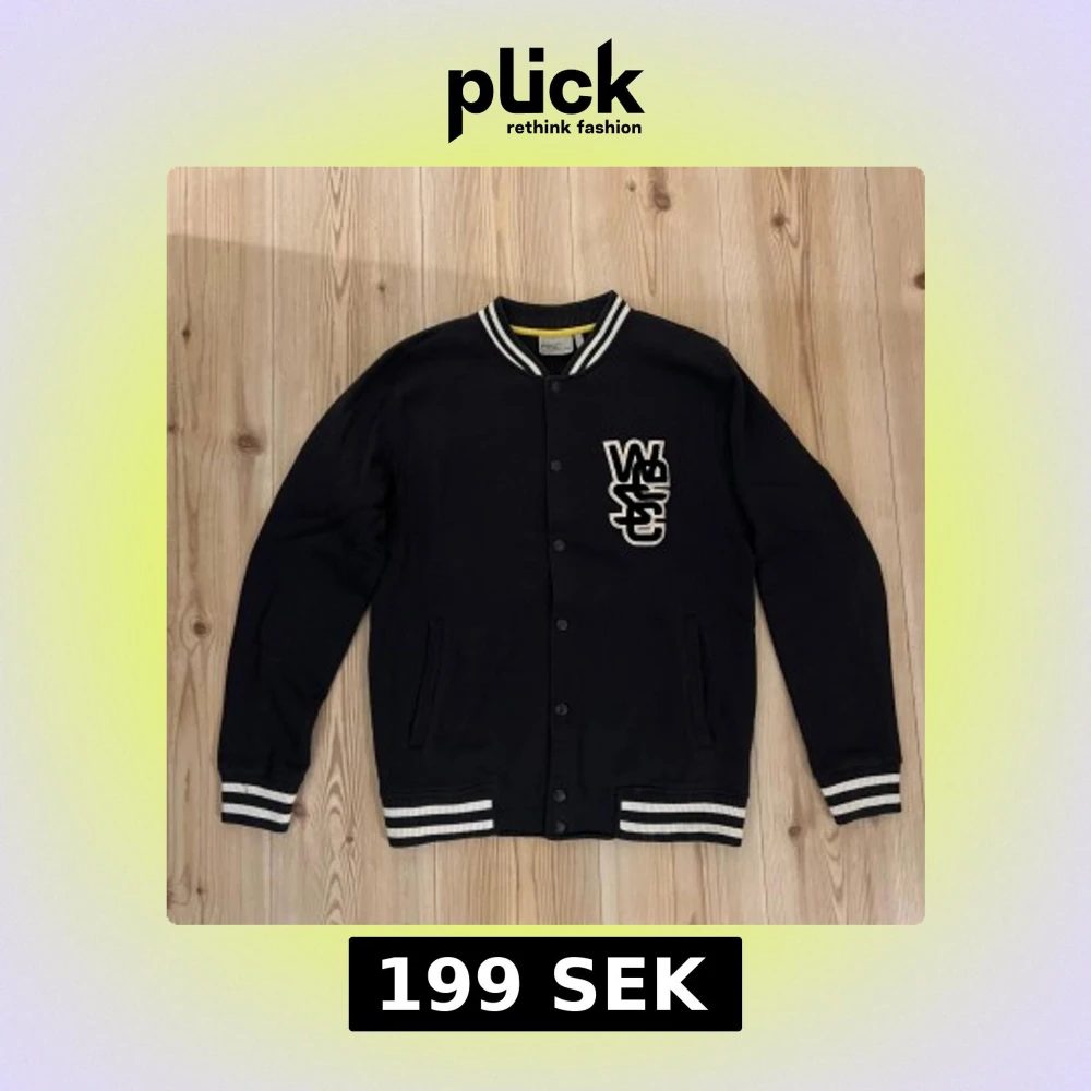 Svart collegejacka från WESC med vita ränder på krage, ärmslut och nederkant. Jackan har tryckknappar framtill, två fickor och ett stort WESC-märke på bröstet. Tillverkad i mjuk bomull, perfekt för en chill streetwear-look.