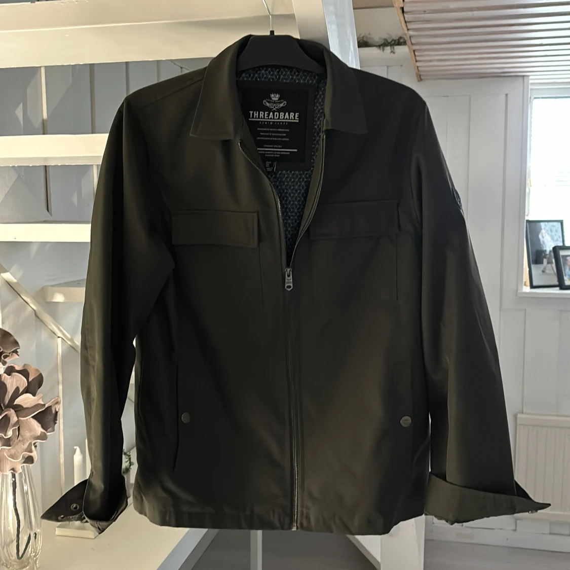 Snygg olivgrön jacka från Threadbare med dragkedja framtill och stilrena fickor på bröstet. Jackan har långa ärmar med knappar vid ärmsluten och en klassisk krage. Perfekt för en casual look. Storlek s passar m