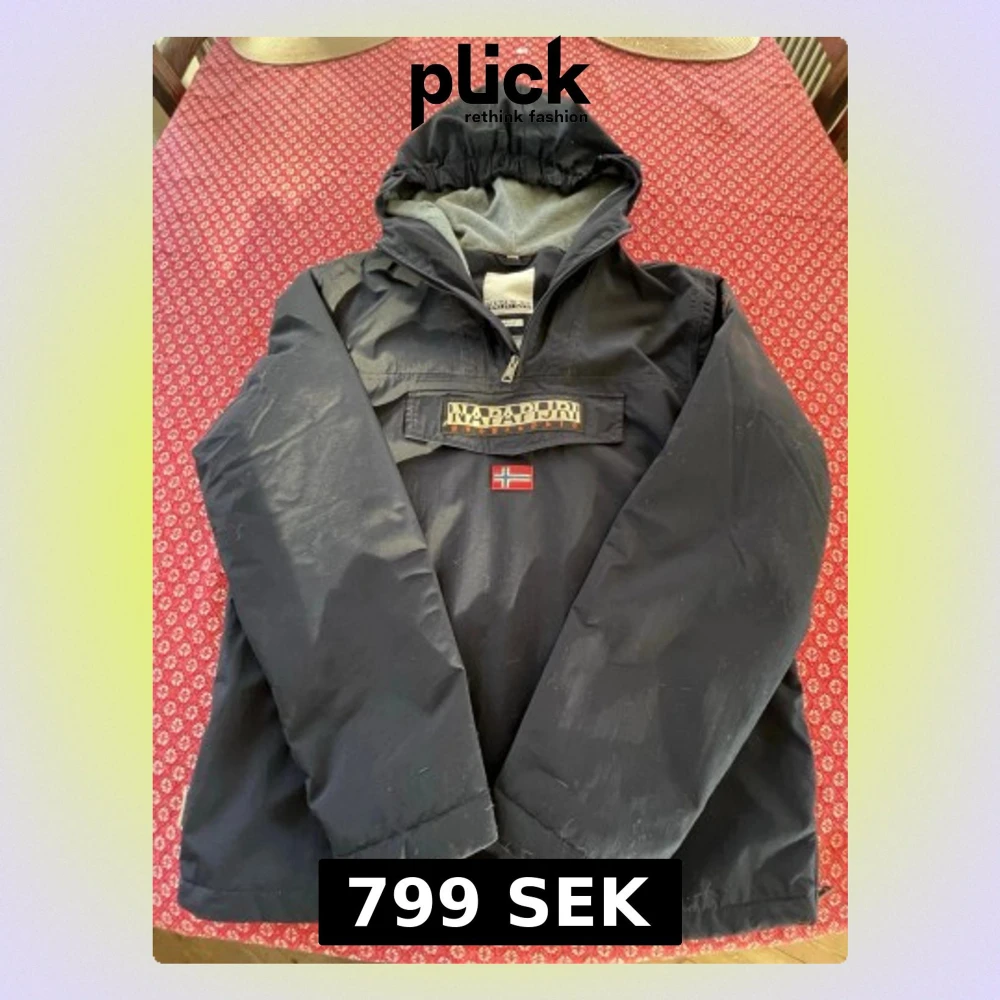 Säljer en svart vindjacka från Napapijri med huva och stor ficka framtill med dragkedja och kardborre. Jackan har Napapijri-logga och norsk flagga på bröstet. Insidan är fodrad med mjukt grått tyg. Perfekt för kyliga dagar.ny pris 1799 mitt 799,priset är inte hugget i sten